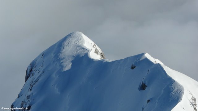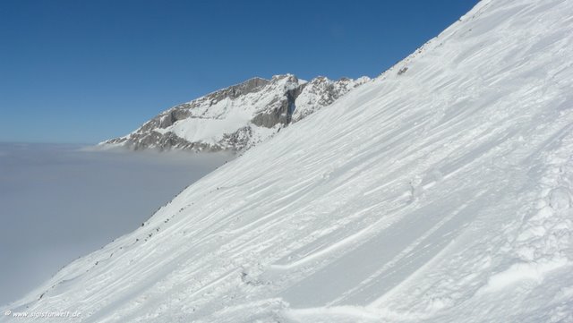 Tourenverhältnisse: Gäbe es nicht den Nebel wäre das heute ein Traumtag gewesen. Schöner 20cm Pulver auf tragenden Harschdeckel machte echt Spaß. Leider öffnete der Hochnebel erst ab einer Höhe von 2000m, so musste auf den unteren Hängen vorsichtig abgefahren werden um nicht die Orientierung zu verlieren. Am Gipfel zwar kühl, aber kaum Wind, so konnte die Aussicht genossen werden.