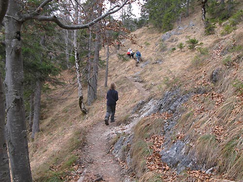 Tourenverhältnisse: Weg trocken, Wetter jedoch ab Mittag stark bewölkt und in der Gipfelregion starker Föhnwind.