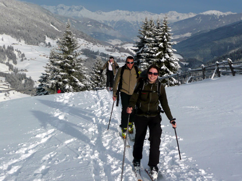 Schnee in der Abfahrt: viel Pulver, meist schon zerspurt, unten raus wird die Schneedecke dünner, doch auf den Grashängen geht es nahezu kratzerfrei. Lawinenrisiko minimal. Die Sattelbergalm hat seit gestern geöffnet. Fazit: Wenn bei uns nix geht, muss man halt ein wenig weiter fahren, hat dafür aber echten Skitourengenuss.