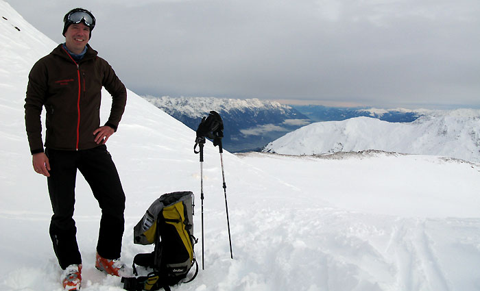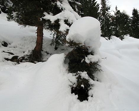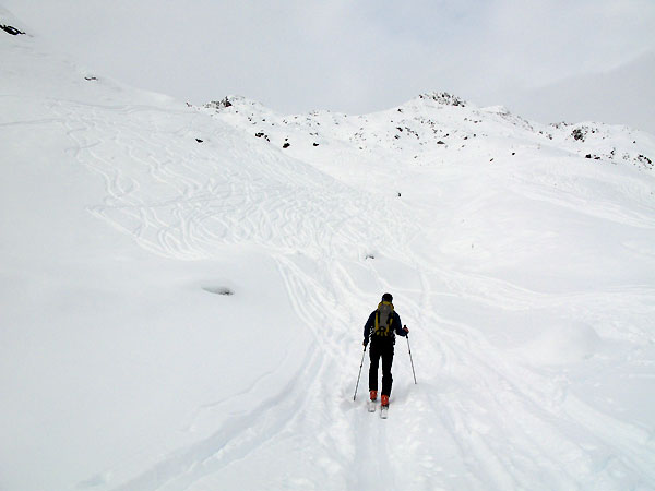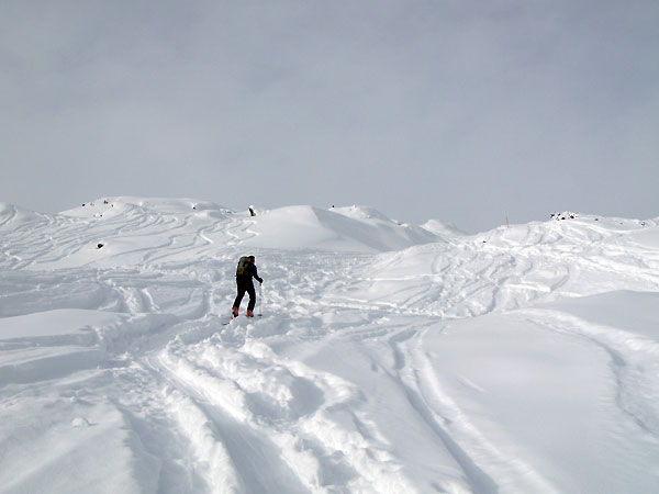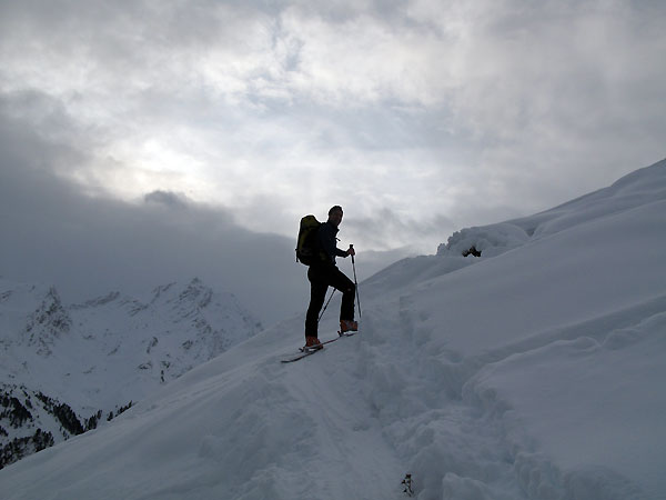 Tourenverhältnisse: Ausreichend Schnee von unten weg, überwiegend tragender Untergrund. Bis ca. 2200 m muss man dennoch auf Steine aufpassen; man kann hier jedoch bequem auf dem gewalzten, breiten Forstweg abfahren. Das ist in diesem Bereich derzeit zu empfehlen. Oben zunehmend pulvrig, wobei der Schnee im Tagesverlauf deutlich schwerer wurde. Wärmeeinbruch auch im Hochgebirge - am Ausgangspunkt auf 1700 m hatte es mittags deutliche Plusgrade.