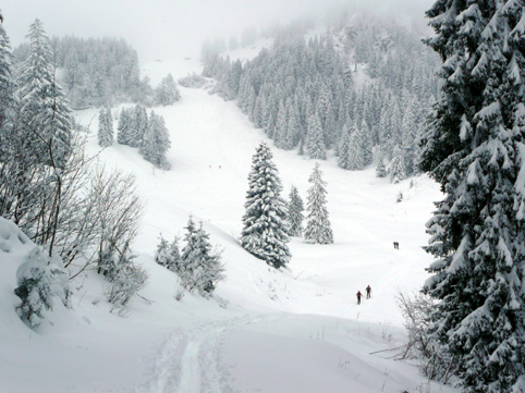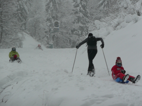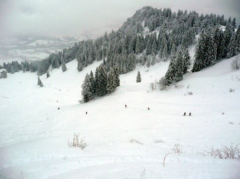 Fazit: Obwohl der große Schneefall erst am Freitagabend einsetzte, liegt recht viel Schnee (unten ca. 30 bis 40, oben 60 bis 70 cm). Steinberührungen sind auf beiden Abfahrten nicht ausgeschlossen, halten sich aber in Grenzen; unten heraus ist z.B. der Streidlhang perfekt befahrbar - die Probleme lauern eher vereinzelt dort, wo steileres Gelände von den gestern über 200 Tourengehern noch nicht so zusammengefahren ist. Die Strecke Garland, Weltcup- und Streidlhang wurde zudem auch von einigen Familien mit Zipfelbobs gemacht und entsprechend eingespurt. Heute oder morgen will die Bergbahn mit der Pistenpräparation sowie der Maschinenschneeproduktion beginnen.