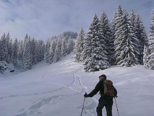 - Fahrt hinauf zum Spitzing und Start am Parkplatz des Kurvenlift's ( noch nicht in Betrieb ), erst relativ flach hinüber z. Lyraalm und etwas hinab zur Valeppalm. Hier nun rechts hinauf ( ausgeschildert ' Stolzenberg ' ) über schön verschneiten Forstweg zur Haushammeralm. Nun in schönem Pulverschnee in einer älteren Schneeschuhspur, nach einer längeren Querung nach Westen, über eine Schneise von NW hinauf zum Felsriegel unterm Gipfelaufbau. Diesen umgingen wir links ( weiter drüben Felsabbrüche der Hoferhöll ! ) und waren gleich am unscheinbaren, nicht ausgeprägten Gipfel des Stolzenberg. Nach kurzer Rast in der Sonne Abfahrt ! in die Scharte vorm Rothkopf, hier nochmal angefellt und Anstieg auf denselben ( Wegweiser Roßkopf die nach links weisen nicht beachten ! - immer an bewaldeten Rücken gerade hinauf ). Weiter mit Fellen kurz hinab in die Senke vorm Roßkopf ( hier sahen wir schon mit Graus unsere Kollegen wie Pinguine rumstehen - toll ), also schnell hinauf - fertigmachen für die Abfahrt und schöne Abfahrt über die Skipisten direkt zum Auto.