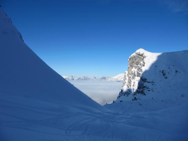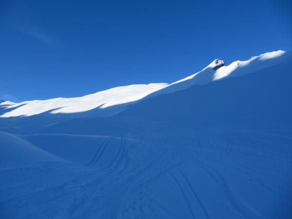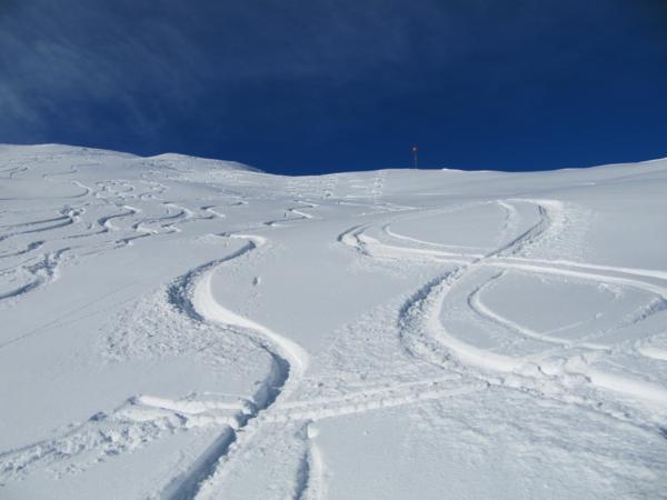 Tourenverhältnisse: Super. Bei der Anfahrt bis zur Axamer Lizum Nebel mit leichtem Schneefall. Ab dem Abzweig von der Piste in das Lizumer Kar nur noch wolkenloser Himmel. Traumpulver ohne Bodenkontakt. Im unteren Bereich etwas zerfahren.