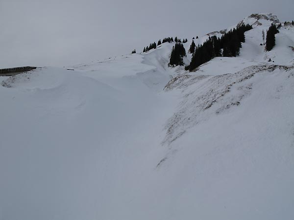 Gefahreneinschätzung: In diesem Gelände gering. Habe allerdings ein bisschen gegraben unterm Gipfel. Die Verbindung mit der Harschschicht war gar nicht so schlecht, jedoch gab es noch eine ganz dünne Gleitschicht darüber mit ganz lockerem Schnee und hier ist der darüber liegende vom Wind gebundene Schnee sofort als ganze Scholle abgegangen - ganz leichtes Anklopfen hat genügt!