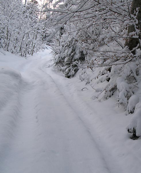 Tourenverhältnisse: Auf der Forststraße ausreichend Schnee und gut zu fahren. Auf de Karrenweg, Traktorspuren und noch recht wenig Schnee - Grundkontakt unvermeidbar (jedoch ohne Schaden).