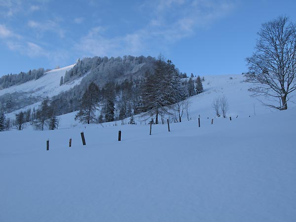 Die Almwiese ab Jagdhütte is Waldrand viel Schnee (ca. 50 cm Pulver) und auch super zu fahren.