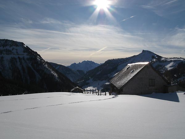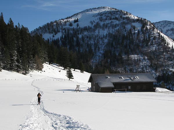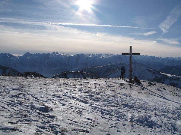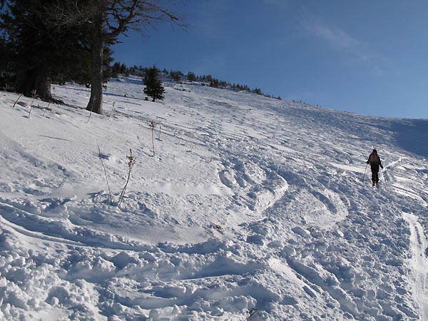 Um die Genneralm herum dann viele verblasene Flächen. Der Gipfelaufstieg durch den Lärchenwald hat ausreichend Schnee (Pulver auf Harsch oder Eis) ist aber schon recht verspurt, ebenso der freie Gipfelhang.