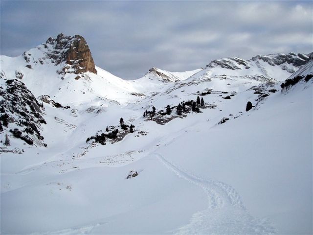 Tourenverhältnisse: Besser als ich erwartet hatte. Natürlich wäre mehr Schnee gut, aber man schafft die Abfahrt zur Bergstation der Rofan Seilbahn ohne Steinkontakt. Im Gegenteil, wir konnten unsere eigenen schönen "Zöpfe" in den Schnee flächten. Wetter: Bewölkt, windstill. Übrigens bekommt man mit dem DAV-Ausweis Ermäßigung an der Seilbahn. So kostet die Berg- und Talfahrt statt 17€ nur 15,50€. Ins Tal abzufahren in nicht ratsam. Ein Tourengeher berichtete vom Aufstieg über die Piste von vielen Steinen. Er selbst fuhr dann auch mit der Gondel runter. Außerdem ist die Abfahrt eh gesperrt.