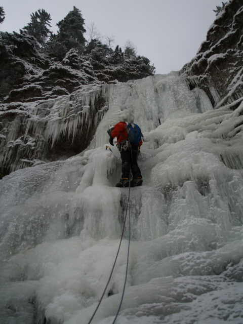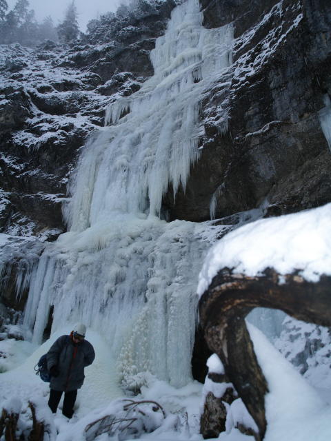 Tourenverhältnisse: Wir sind nur die 1. und die 3. Stufe geklettert, 2. Stufe hatte uns zu wenig Eis (rechts leicht umgangen), die 3. sind wir erst nach einigem Überlegen eingestiegen. Sie ging dann besser, als gedacht. Allerdings ist das Eis auch dort noch eher dünn und das Wasser läuft noch ziemlich... Ettaler Mühlenfall eher schlecht laut Auskunft anderer (tw uns bekannter) Eiskletterer. Insgesamt braucht es noch einige kältere Tage...