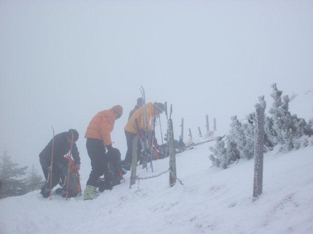 Tourenverhältnisse: Der vorhergesagte Neuschnee ist leider ausgeblieben. Verhältnisse sind nicht wirklich gut, Gras- und Felskontakt bleiben nicht aus. Wegen Nebel sind wir heute nach einer Iglu-Nacht vorm Rotwandhaus nur auf eine kurze Tour auf den Lempersberg und von dort aus direkt zum Spitzingsee zurück, Abfahrt bis zum Bergwachthaus war ganz OK, Straße am Rand entlang ging gerade so.