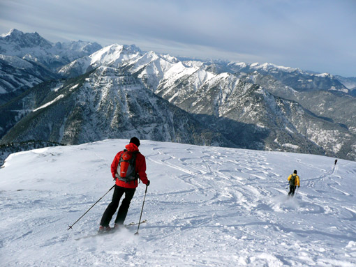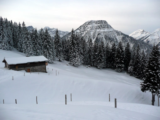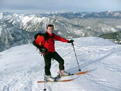 Bei schönem Skitourenwetter (wenig Bewölkung, kalt) ging es auf der üblichen Route auf den Schafreuter (2101 m). Ich hatte zwei Paar Ski im Auto und entschied mich am Parkplatz für die alten Steinski - die richtige Wahl, wie sich später herausstellen sollte.