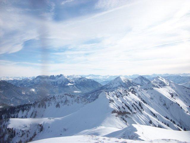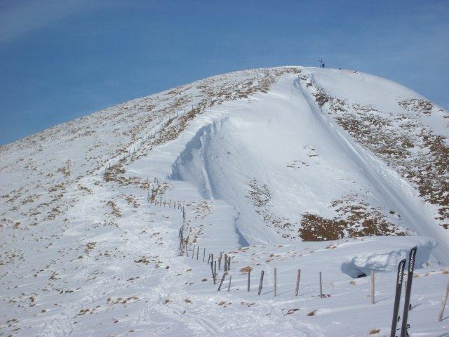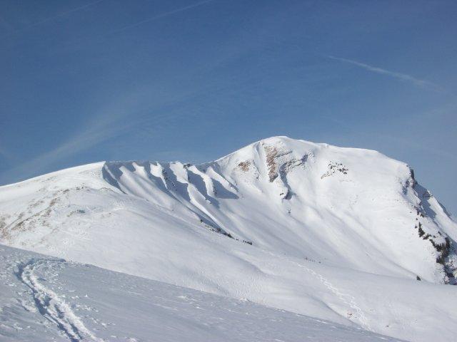 Tourenverhältnisse: Ganz OK für diesen Winter. Vom Parkplatz weg gut zu gehen, herrliches Wetter, kaum Wind und fast schon zu warm. Gipfel macht man besser zu Fuß, da sprechen die Fotos für sich. Abfahrt: zum Teil recht gut zu fahren, zum Teil Harschplatten mit Pulver obendrauf und unvermeidbar an den Südhängen Gras- bzw. Felskontakt.
