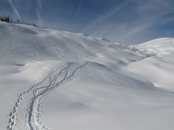 Hählekopf: die Mulde nördlich vom Gipfel hatte traumhafte Verhältnisse ebenso andere Schattseiten (siehe Bilder). Die Südflanke hatte einen leichten Deckel, der aber in der Sonne relativ weich wurde.
