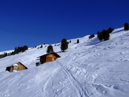 Derzeit sehr gute Verhältnisse, bereits wenige Meter hinter dem Pp. an der kleinen Brücke kann man "anschnallen". "Autobahnartige" Spur bis hinauf zum Aussermelang-Hochleger (Ski- und Schneeschuh-Spur brav nebeneinander). Danach biegt die Hauptspur nach NO Richtung Grafensspitze ab, zum Hippold nur alte, eingewehte Spur-Reste. Orientierung bei guter Sicht aber einfach.