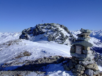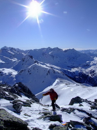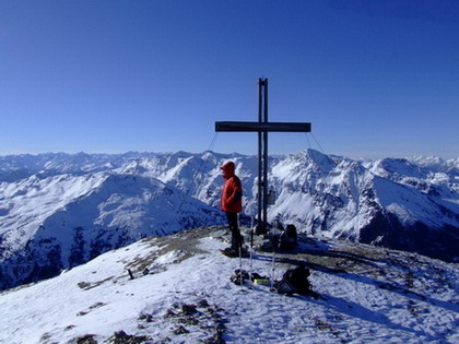 Für Ski: im welligen Gelände steter Wechsel zwischen hartgepressten Stellen und eingewehten Mulden, dort schönster Pulverschnee. Die wenigen freigeblasenen Kuppen kann man leicht umfahren. Das Gelände ist so weitläufig und bisher noch relativ wenig verspurt, sodaß man eigentlich lohnende Abfahrten finden sollte. Gipfelhang steil und pickelhart