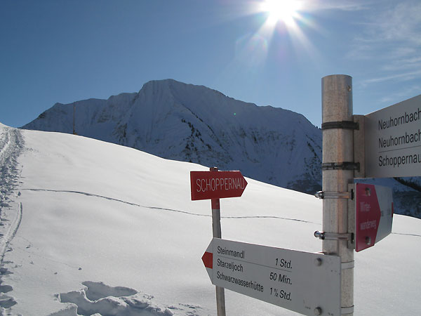 Route: Auenhütten - Schwarzwasserhütte - Gerachsattel - Neuhornbachjoch - Falzer Kopf - Neuhornbachhütte - Steinmandl - Schwarzwasserhütte - Auenhütte. Insg. 21 km.