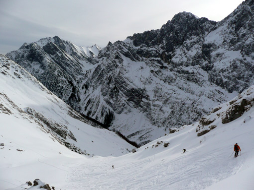 Abfahrt durchs Tortal: oben schöne Hänge, dann Achterbahnfahrt durch ausgefahrene Abfahtsspur rund um die dicken Wacker (teils etwas mühsam, aber gut machbar), ab der Tortalalm gemütlich auf dem Forstweg bis Hinterriss. Insgesamt wenig Steinkontakt.