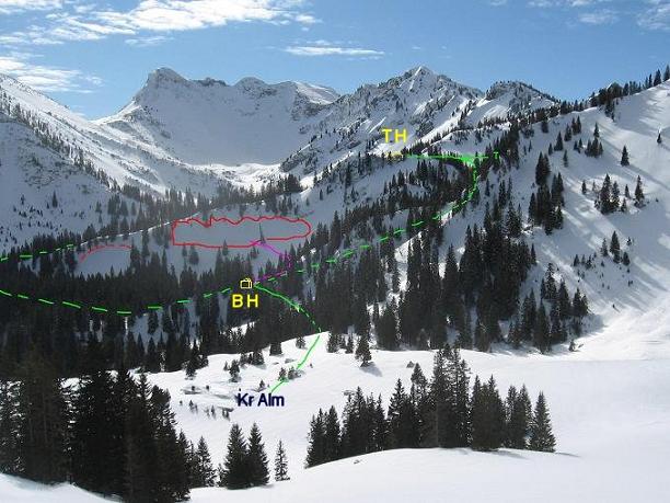 Das Foto auf der Seite des Lawinenwarndienstes ist am Sonntag abend von Georg Kronthaler aufgenommen worden, und Georg stand beim Fotografieren genau in der Spur mitten zwischen Bachtobel-Engstelle und Bayerländerhütte, über die der normale Weg Richtung Taubensteinhaus kurzzeitig Richtung Westen führt, also quasi in den Rücken des Fotografen.Hallo Eduscho,