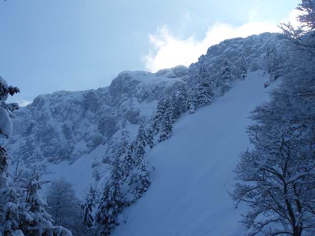 Gefahreneinschätzung: am Kochler Eck auf ca. 1500 m abgebrochen, Hanglage über 30° , Nordwestlage 40 cm Pulverschnee,