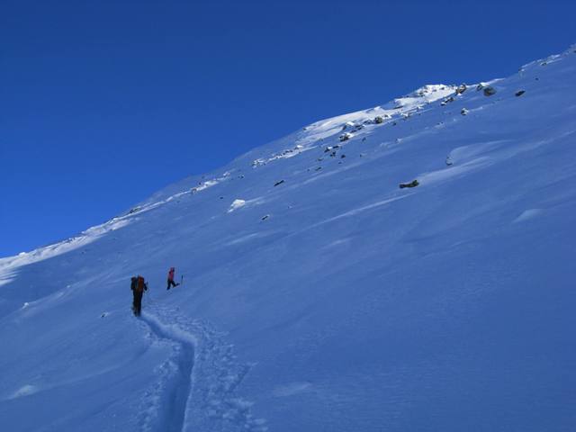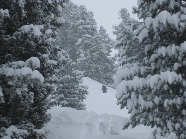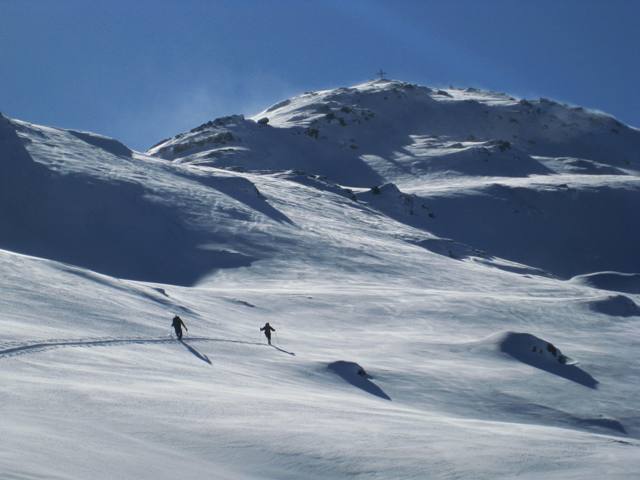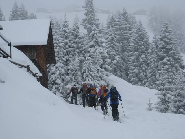 Tourenverhältnisse: Am Samstag bei starkem Schneefall und Wind über die Fiderrissalm auf die Roßlaufspitze. Abfahrt zurück zum Forstweg, der zur Weidener Hütte führt. Es hatte viel Neuschnee (40cm)der zum Teil stark windverfrachtet war. Mit vernünftger Spuranlage kann man das Gelände aber gut ausnützen. Danke auch an die Locals, die gespurt haben. Finaler Aufstieg zur Hütte. Heute Aufstieg bei Sonnenschein, aber starkem Wind, zur Halsspitze. Über Nacht hat es sehr stark gewindet und den Schnee dementsprechend verfrachtet. Anstrengende Spurarbeit über den gestuften Westhang, wobei man gut aufpassen musste um nicht in zu steiles Gelände zu kommen. Zum teil extreme Windverfrachtung! Abfahrt entlang der Aufstiegsroute zur Weidener Hüttte. Die Schneedecke ist großteil noch ziemlich locker und grundlos. Auch sind die Steine oft nur mit wenig Schnee überdeckt. Nach kurzer Pause gings noch auf den Hohen Kopf und geniale Abfahrt zur Fiderirssalm. Über die Rodelbahn/Forstweg zurück nch Innerst