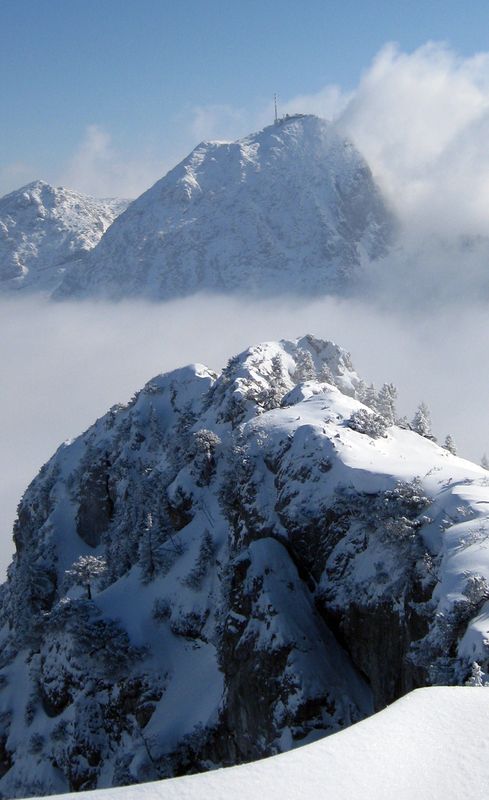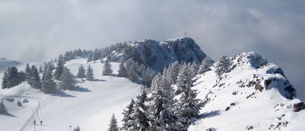 Tourenverhältnisse: Vom Parkplatz weg ausreichend Neuschnee. Der mittlerere Hang um die Bucheralm war ein Traum mit noch vielen freien Stellen zum Runterwedeln. Hier mussten wir dann zweimal rauf. Am Gipfel einige Leute, aber kein Gedränge und das Beste natürlich das Wetter mit interessanten Stimmungen durch den Hochnebel.