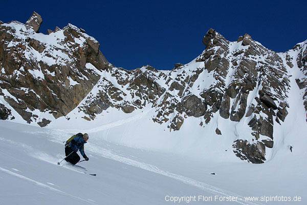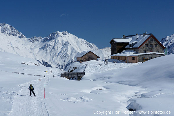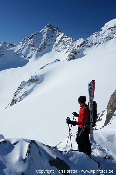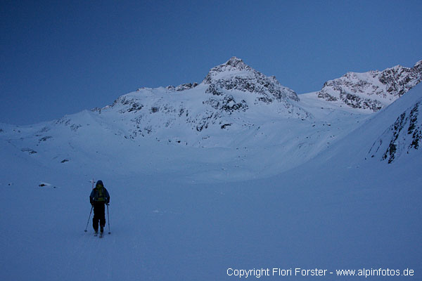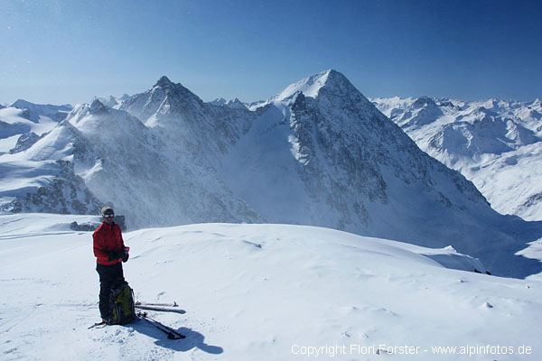 Am So. 7.3. mit Mario nachmittags in gemütlichen 2 Std. von Seduck auf die Franz-Senn-Hütte, gute Spur, bis Oberiss gewalzt. Am Mo. 8.3. kurz vor 6 Uhr bei -20 Grad Richtung Alpeiner Ferner und weiter zum Verborgen-Berg-Ferner. Dort endlich Sonne und weiter bis unter die Turmscharte. 20m an Fixseilen in die Scharte. Weiter mit Ski bis zum Gipfel, knapp 4 Std. Die Gipfelrast war bei -24 Grad und böigem Wind doch recht kurz...Abfahrt auf Aufstiegsweg zurück zur Hütte. Oben sehr guter Pulver, ab Alpeiner Ferner windgepresst und schon sehr verspurt. Flotte Abfahrt in 25 Min nach Seduck.
