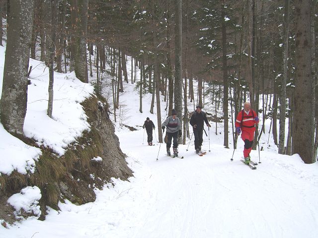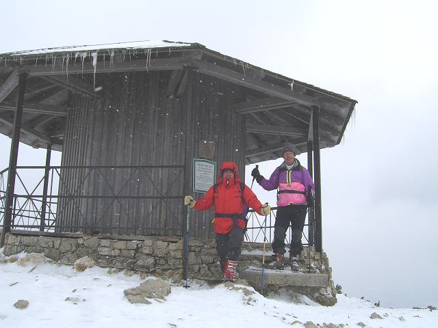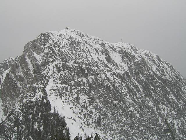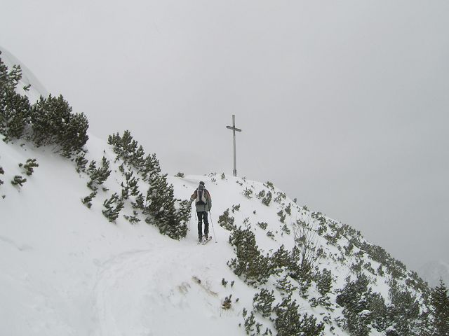 Tourenverhältnisse: am Vormittag leichter Schneefall, trotzdem passable Sicht; am Gipfel stürmisch; Gipfelhang nur auf dem schmalem Sommerweg mit ausreichend Schnee; Abfahrt über Piste sehr gut auf fester Unterlage mit Neuschneeauflage; 'Reitweg' war Mittag bis zur letzten Kurve noch OK, mit fester aber dünner Altschneeschicht, nur gelegentlich Steine; hat sich bis Abend sicher schon verschlechert da viele Tourengeher unterwegs waren