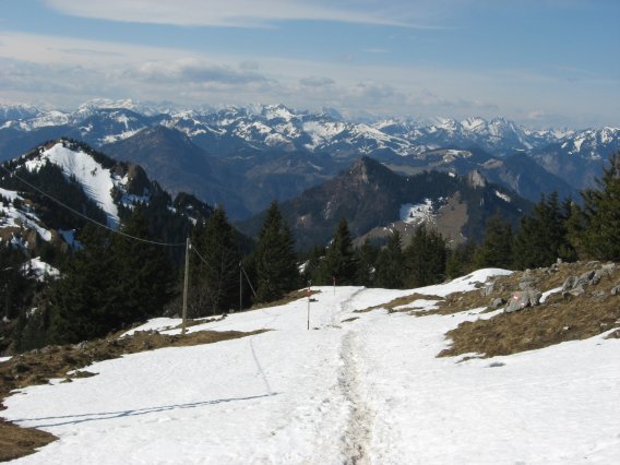 Tourenverhältnisse: Wege im unteren Teil aper; im oberen Teil oft noch Altschnee (problemlose, eingetretene Spur; keine Gamaschen nötig). Nur wenige bazige Stellen.