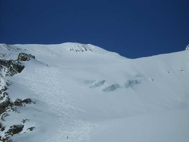 Abfahrt: 20 - 40 cm Pulver, untenraus zum Joch etwas schwerer aber noch sehr gut zu fahren; ab hier dann bester Firn weiter bis zur Hütte ; Hüttenabfahrt s.o.