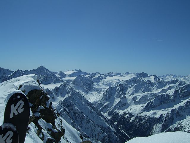 Gipfelanstieg: in der Früh hart gefroren (ging gut ohne Harscheisen) von der Hütte bis zum Zwieselbachjoch auf ca. 2900; dann weiter in bestem Pulver mit Ski (von links her) bis zum Gipfel; keine offenen Spalten sichtbar