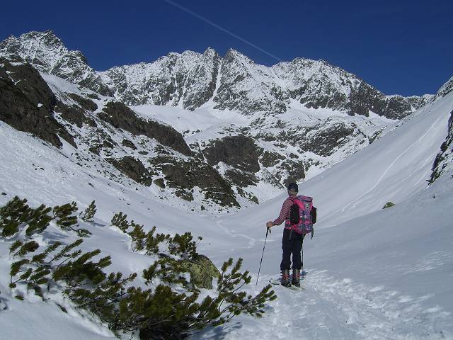 Gefahreneinschätzung: gering - mäßig, es rauschte zwar aus den steilen Felswänden entlang des Aufstiegs immer wieder, für größere Lawinen ist momentan zu wenig Schnee; problematischer sind meiner Meinung nach die mit lockerem bzw. durchfeuchteten Schnee bedeckten Felsen, vorsichtig fahren im letzten Drittel der Abfahrt zur Hütte und bei der Hüttenabfahrt