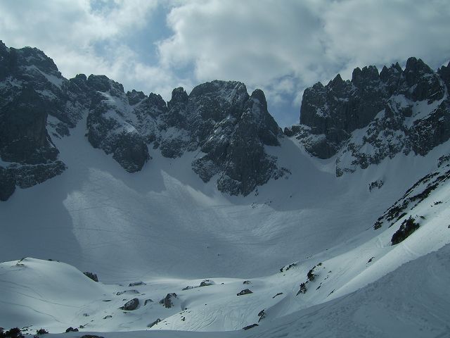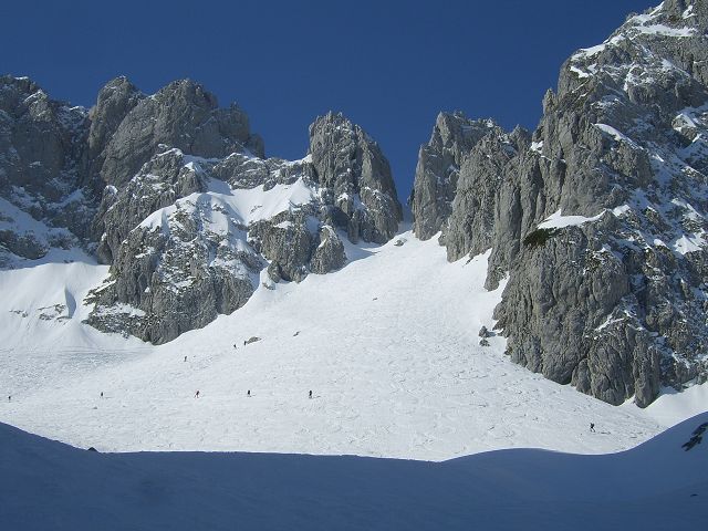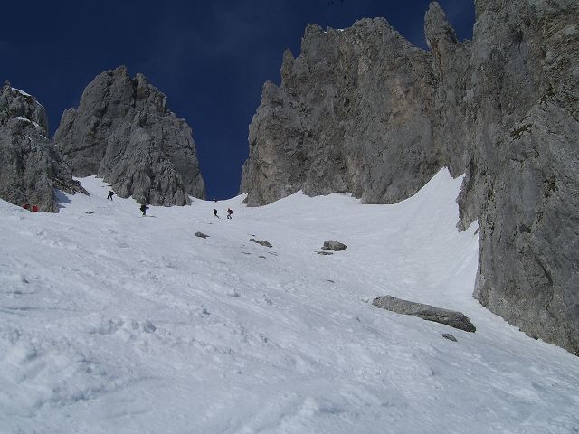 Ski tragen bis zur Russenleite, dann noch mal im Wald ein paar Minuten; weiterer Aufstieg in der Früh bockhart (Harscheisen obligatorisch); erst am Fuß des Kleinkaisers weichere "Piste"; hinauf zur Goinger Scharte in die rechte Rinne; Abfahrt kurz vor 11:00 war grad recht; bin rüber gequert Richtung Kleines Törl; das erste Drittel ging noch gut mit Ski aufwärts, dann zunehmend harter, windgepresster Schnee; keine Aufstiegsspur mehr vorhanden, deshalb den Rest des Aufstiegs in Fallinie hoch gestapft ins Törl, die letzten Meter sind sehr glatt; bei der kurzen Abfahrt ab Skidepot noch etwas Pulver gefunden; leider auch mit Harschdeckel, der nicht mehr aufgemacht hat (s.o.); rüber zur Fritz-Pflaum-Hütte, erster Teil der Abfahrt immer noch sehr hart, erst ab ca. 1700m kam der Firn; ging gut zu fahren.
