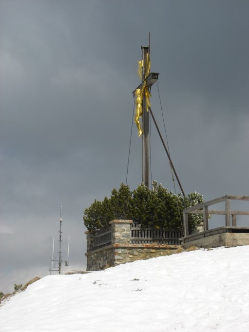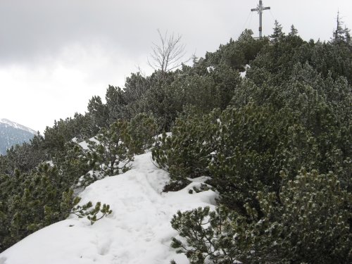 Tourenverhältnisse: Aufstieg (unmarkiert) über Burgrainer Kreuz: Weg war bis kurz unterhalb des Burgrainer Kreuzes aper, aber gefroren (deshalb auch nicht batzig). Abstieg nach Süden (Weg zweigt bei einem Bankerl vom Hauptweg ab, überquert ihn mehrmals und mündet dann wieder in ihn ein) über Eckenhütte und Gamshütte: Wege aper und relativ trocken.
