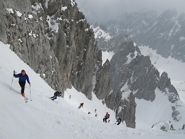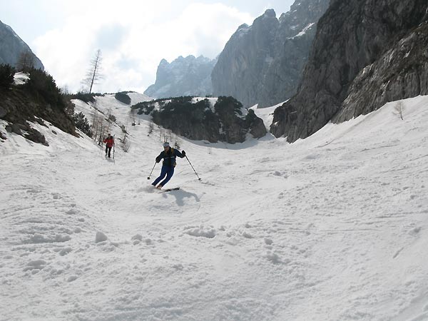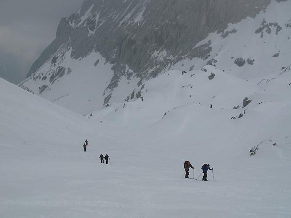 Schneequalität: Auf der Hauptroute pistenmäßig eingefahren, daneben schwerer, jedoch nicht sehr tiefer Schnee. Schon im Aufstieg am Morgen weich (hat wohl reingeregnet); bei der Abfahrt dann ähnlich wie auf einer aufgefirneten Piste - also gut zum Fahren (siehe Bild 5).
