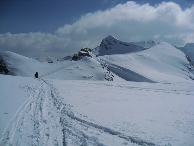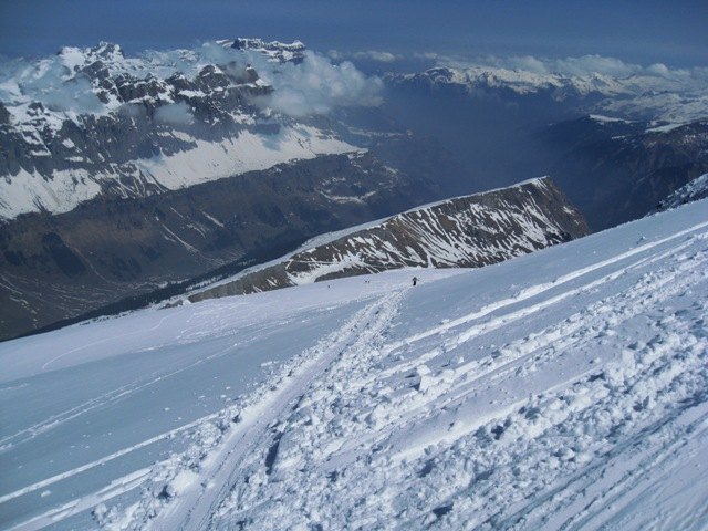 Am Sonntag im Nebel auf den Clariden. Am Gipfel keine Sicht und starker Schneefall. Abfahrt im Blindflug mit GPS. Der Plan auf die Fridolinshütte und am Montag den Tödi zu machen wurde gecancelt, da der Wetterbericht eh unsicher war. Wollten über das Tüfelsjoch zurück zum Urnerboden. Der Übergang war aber stark vereist. Die Kette auf der Nordseite soll aber frei sein. Sind dann über die Claridenhütte zurück nach Tierfehd, wo wir ein zweites Auto parkiert haben. Bis ca. 2000m ca 10cm Neuschnee auf harter Auflage. Danach nur noch fauler Schnee. Ab 1800m kein Schnee mehr und über die Forststraße, mal fahrend meist tragend, im Regen zum Auto.