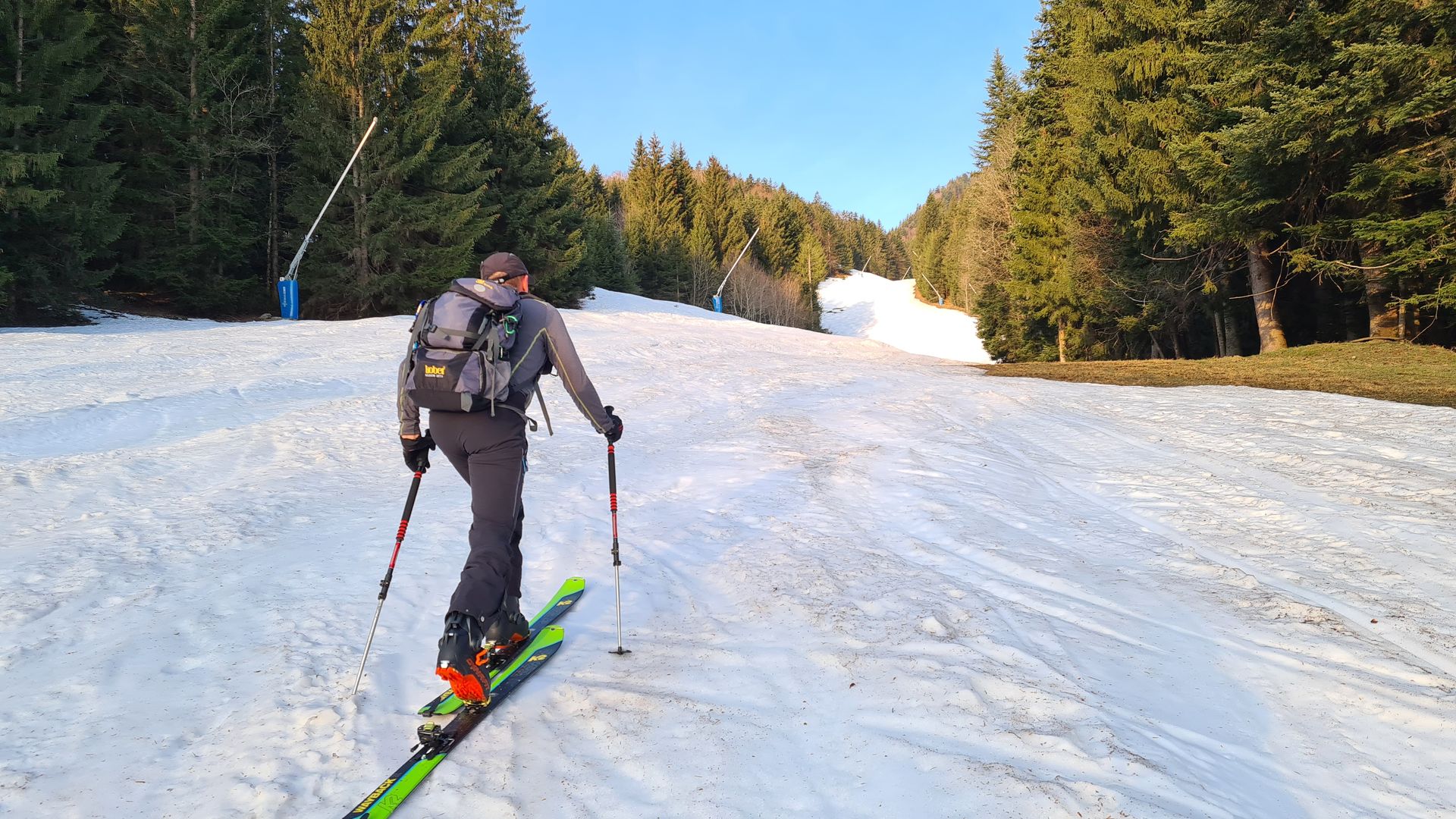 Heute Morgen um 6:45 Uhr war der Schnee am Draxlhang noch recht hart. Der steile Hang links neben dem Milchhäusl war zwar auch noch etwas hart, aber aufgrund der schon morgens recht milden Temperaturen so griffig, dass dort und sonst auch auf dem ganzen Anstieg keine Harscheisen notwendig waren.