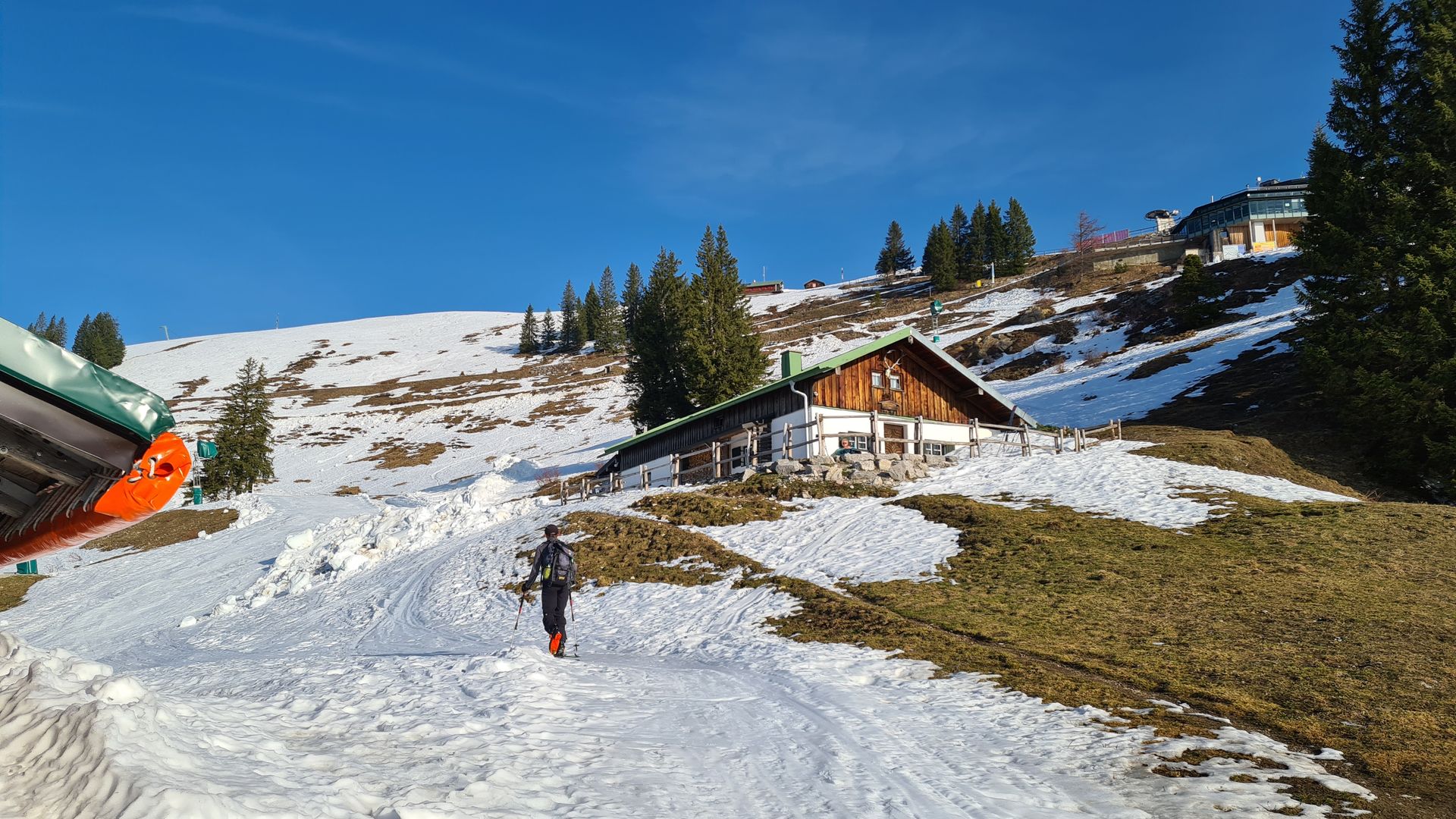 Der breite Südhang unter dem Brauneckhaus ist nicht mehr vollständig schneebedeckt. Mit einem kleinen Schlenkerer über die Schneereste auf der Forststraße kommt man aber gut runter.