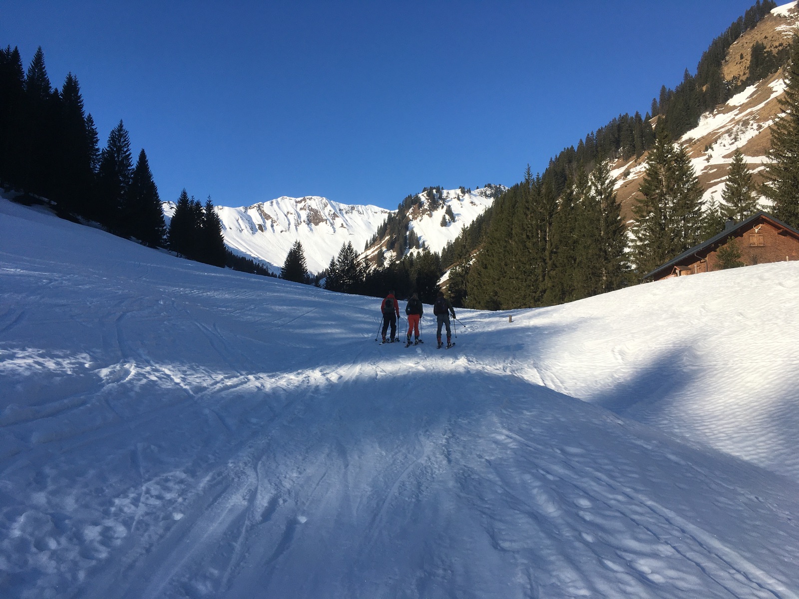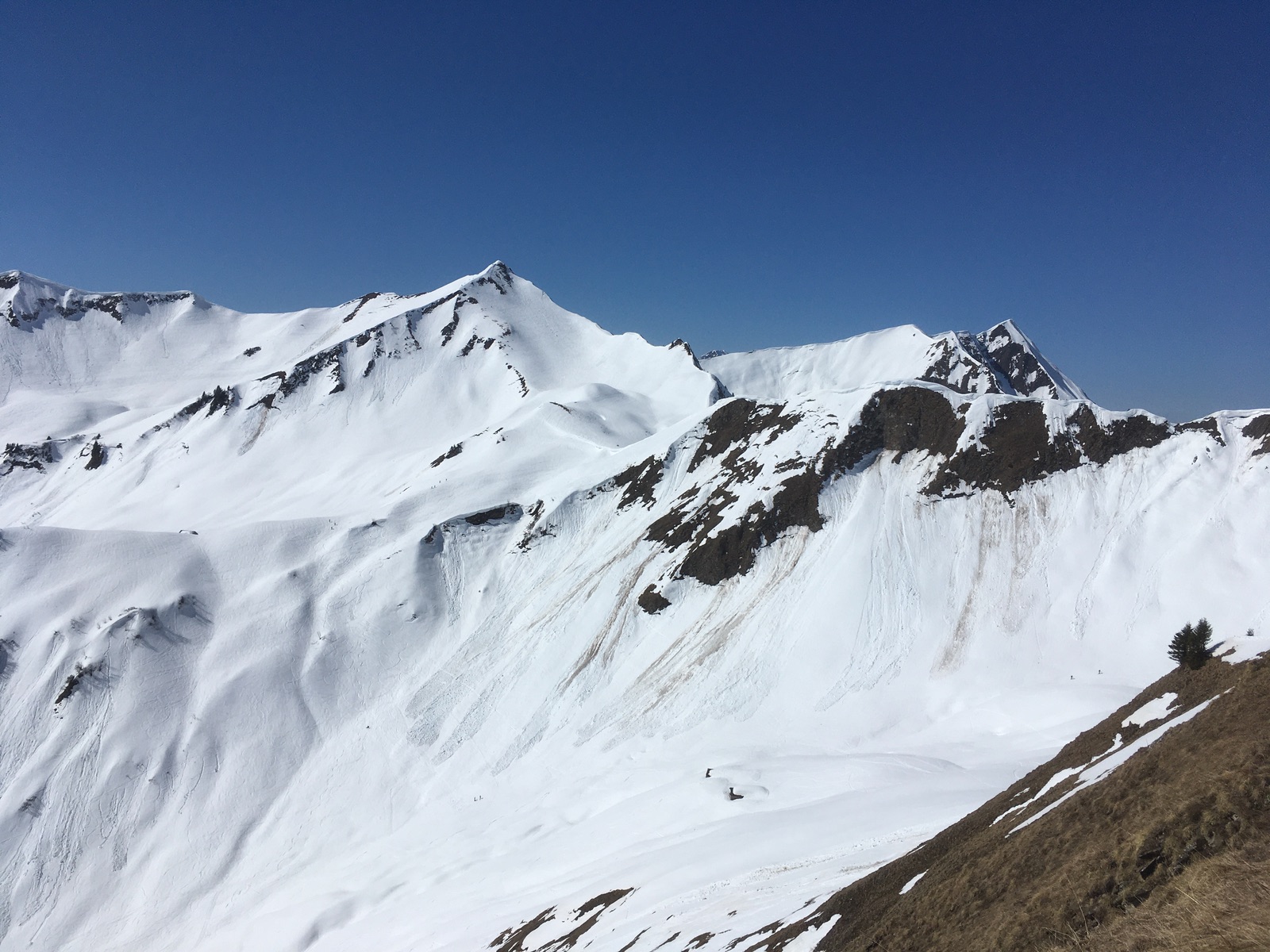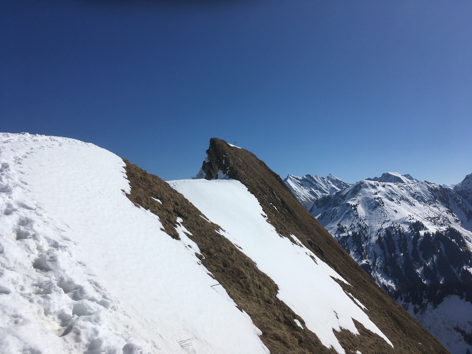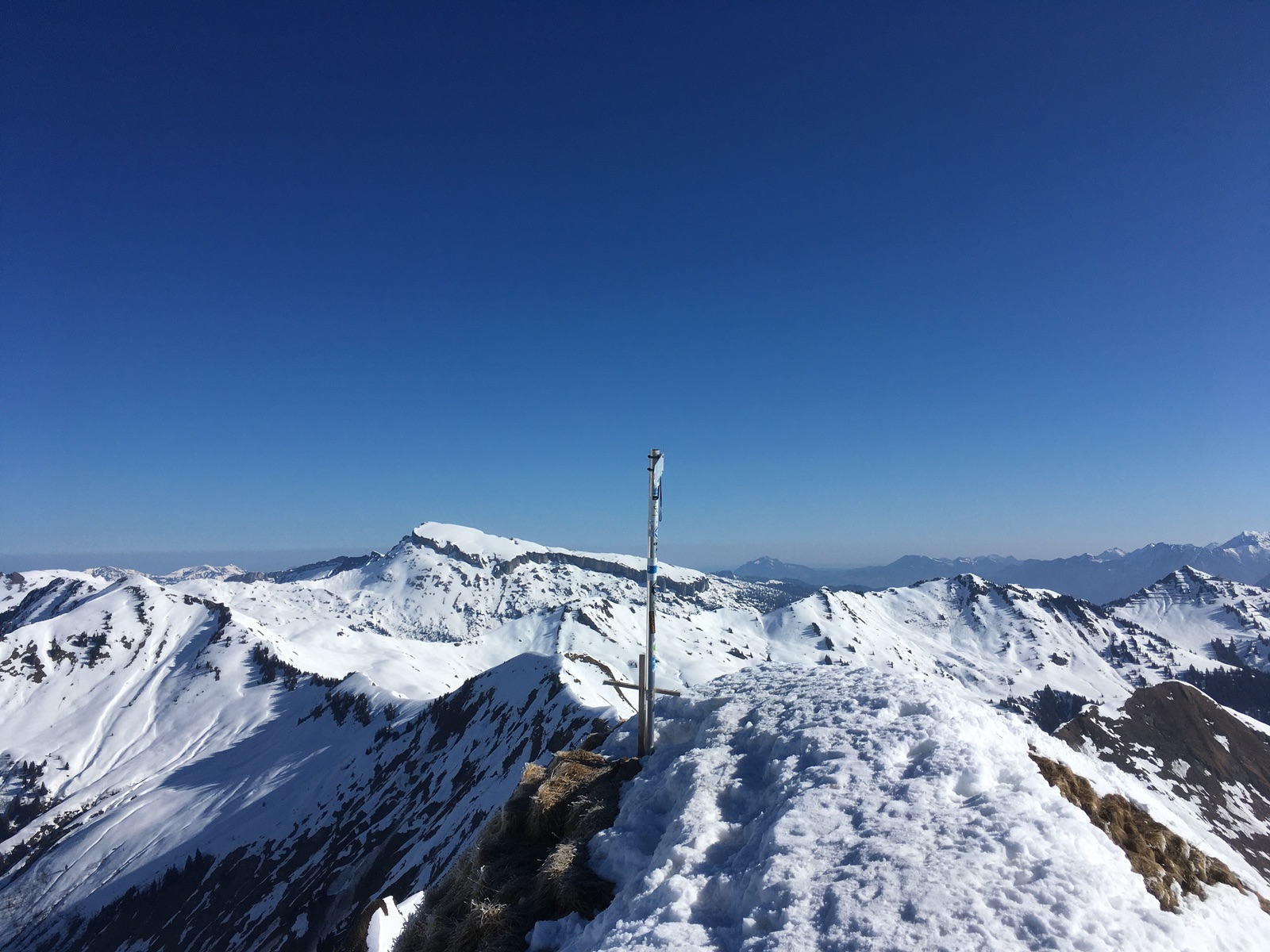 Am Ostersonntag gab es den zu erwartenden Tourengeheransturm im Kleinwalsertal und damit natürlich auch in Baad. Wobei es sich im Gelände doch recht gut verteilt und auch zeitlich gibt es die Frühstarter und die Spätstarter - einige stiegen erst gegen Mittag auf. Wobei mir letzteres an der Güntlespitze vom Gelände her doch fragwürdig erscheint. Schnee gibt es ab dem Tal und auch noch durchgehend. Ich bin durchgehend ohne Harscheisen herauf, es wäre aber wohl doch entspannter gewesen, diese anzulegen (lagen gut im Rucksack). Einige sind sogar Passagen mit Steigeisen herauf. Bis ca. 10 Uhr war es noch erstaunlich hart trotz Sonneneinstrahlung von der Früh weg. Dann ging der Schnee in den stark besonnten Passagen erstaunlich schnell in etwas tieferen Firn über. Nicht so leicht, den idealen Abfahrtszeitpunkt zu finden, allzumal es am Gipfel auch eher kühl war. Das Bergpanorama von der Güntlespitze ist natürlich wirklich gut.