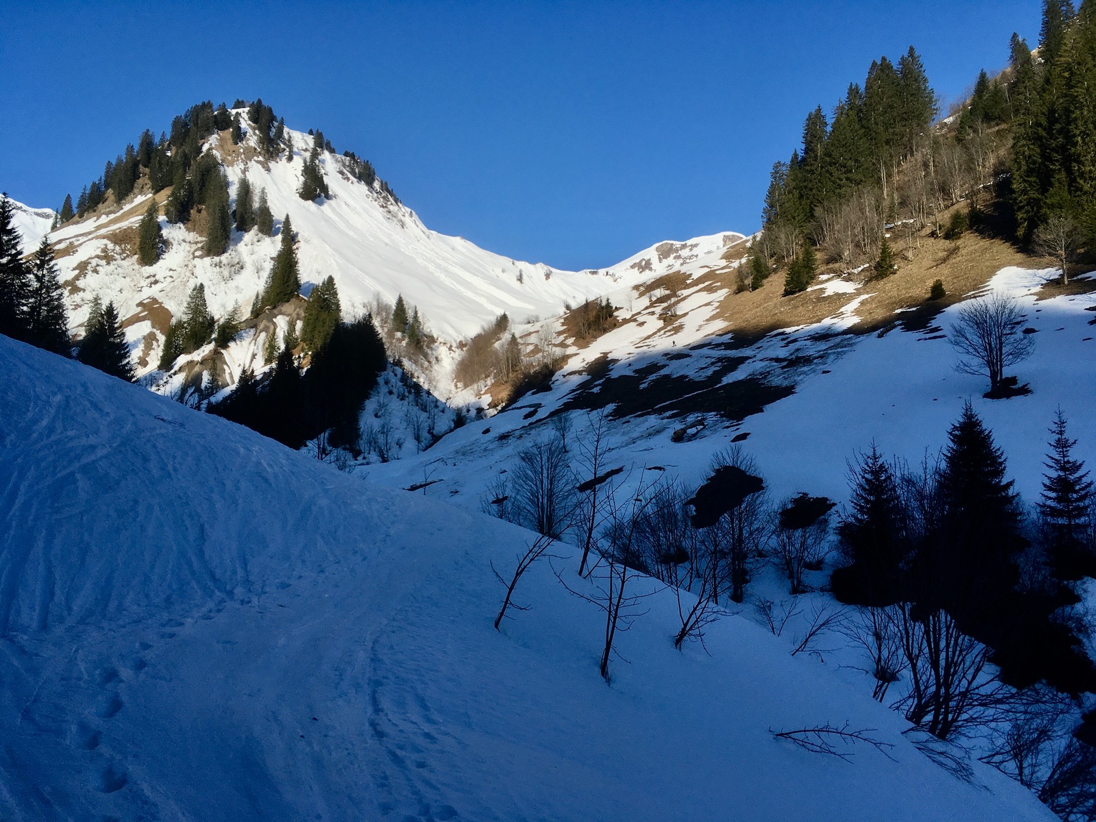Bei der Bachvereinigungen verzweigen sich die beiden Routen - den schon recht schneearmen Hang rechts bin ich in der Abfahrt herunter: