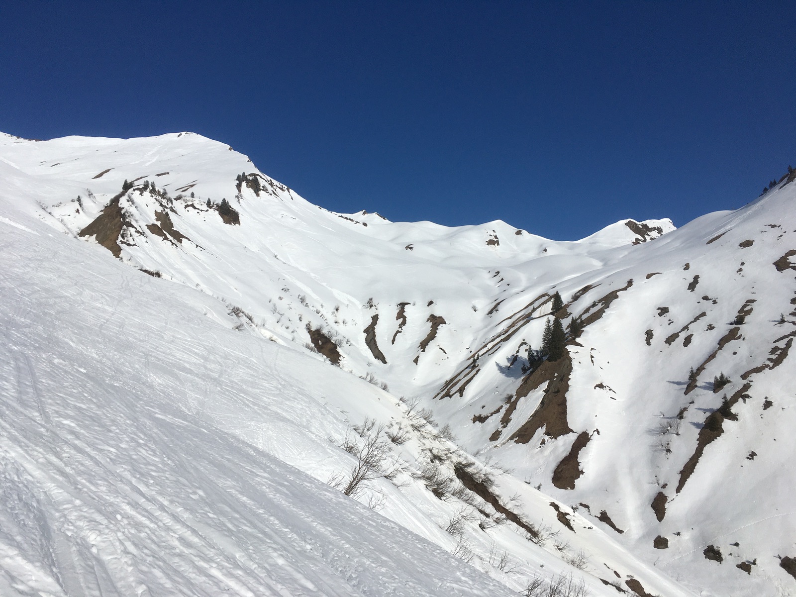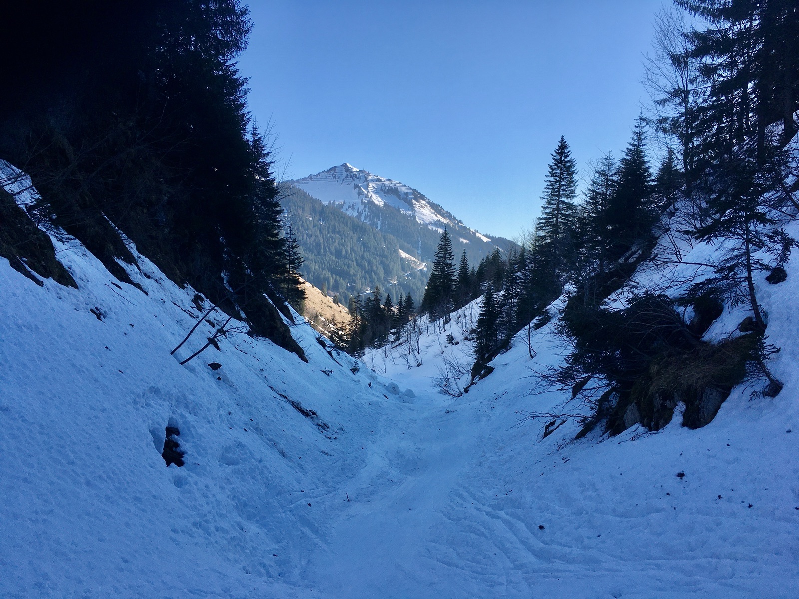 Bei Anstieg über die S-O-Route kommt man durch diesen Tobel (die meisten Lawinen sind schon unten; hier Blick zurück), wobei wohl auch ein Aufstieg oberhalb möglich ist: