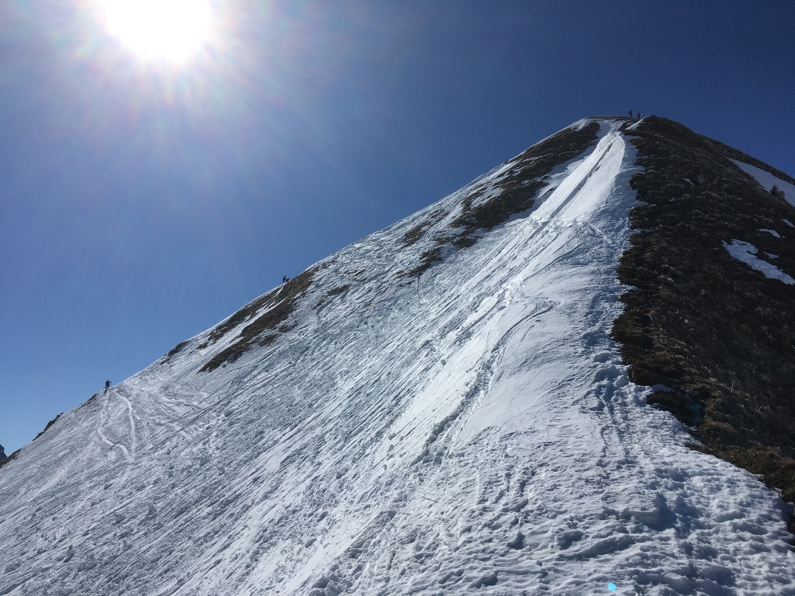 Als Zugabe gab es noch die Unspitze, wobei die letzten ca. 60 Hm auf einem teilweise exponierten Grat zu Fuß erstiegen werden (zwei Kraxelstellen). Dort war es viel ruhiger als an der wuseligen Güntlespitze.