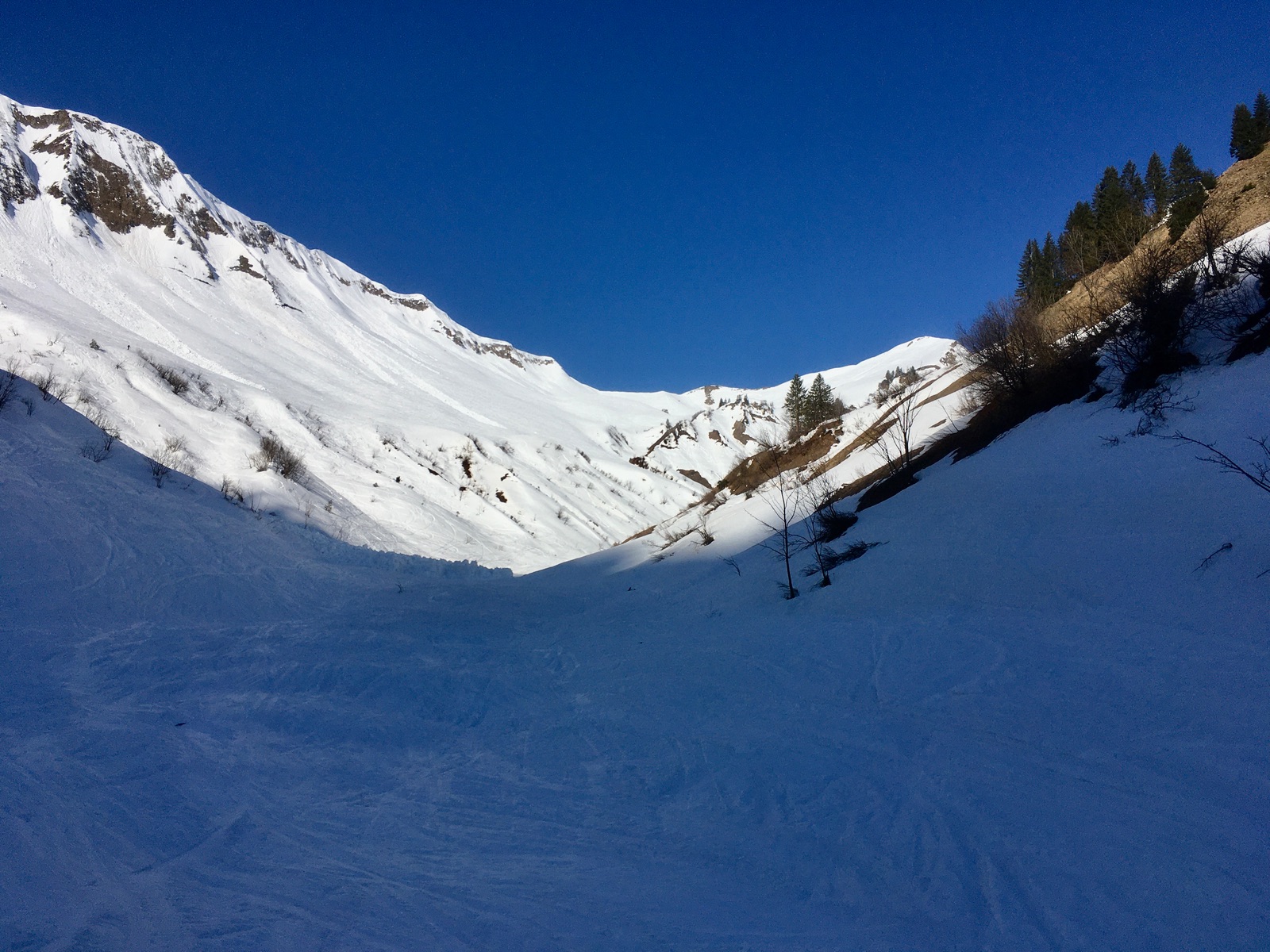 Bei Anstieg über die S-O-Route kommt man durch diesen Tobel (die meisten Lawinen sind schon unten; hier Blick zurück), wobei wohl auch ein Aufstieg oberhalb möglich ist: