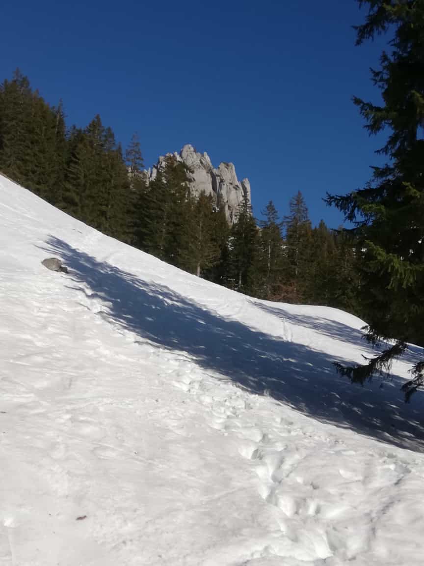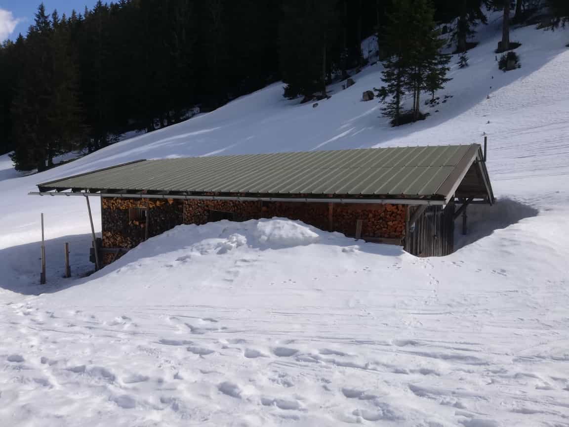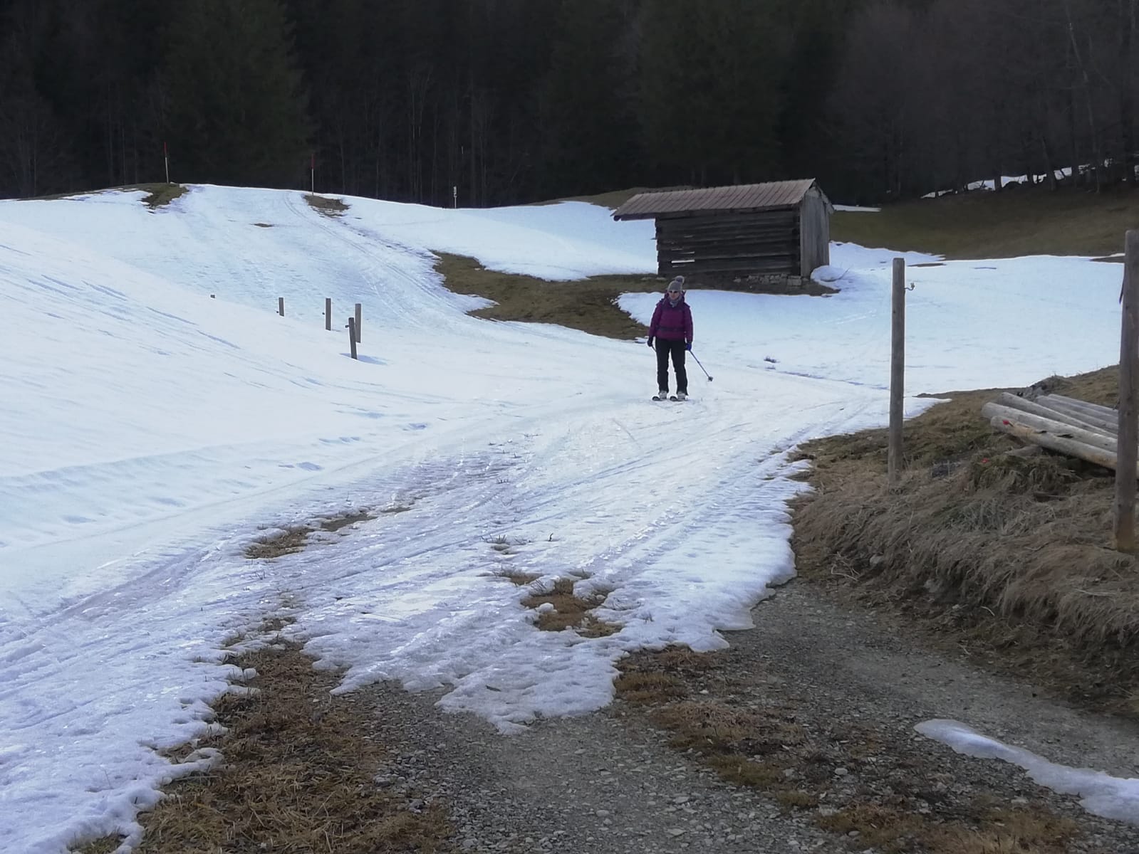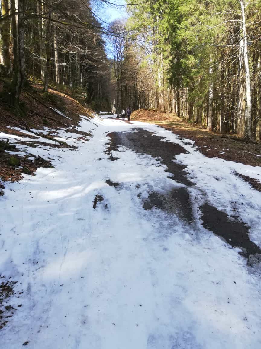 Ab der Kurve oberhalb der Siebli-Diensthütte (P. 1064m) durchgehend Schnee. Bis dahin 5-6 Tragestücke, jeweils 50- ca. 150m lang. Oberhalb der Röthensteinalm durch die Mulden zum Sattel, nicht am Waldrücken (dort kein Schnee).