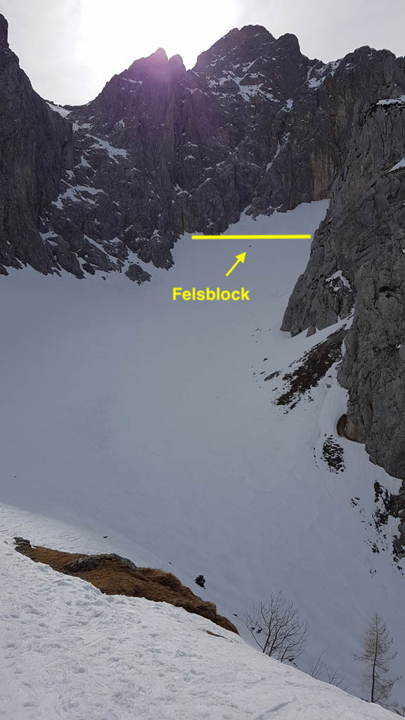 (Mo. 6.4. 17:45) Ergänzung, nachdem gerade der Lawinenlagebericht für morgen 7.4. reinkam: Das Viererkar sollte jetzt definitiv maximal bis auf 1900m gegangen werden, bis zu dem markanten Felsblock in der Mitte unter dem Koflerturm; drüber hat es sicher üble Triebschneebretter.