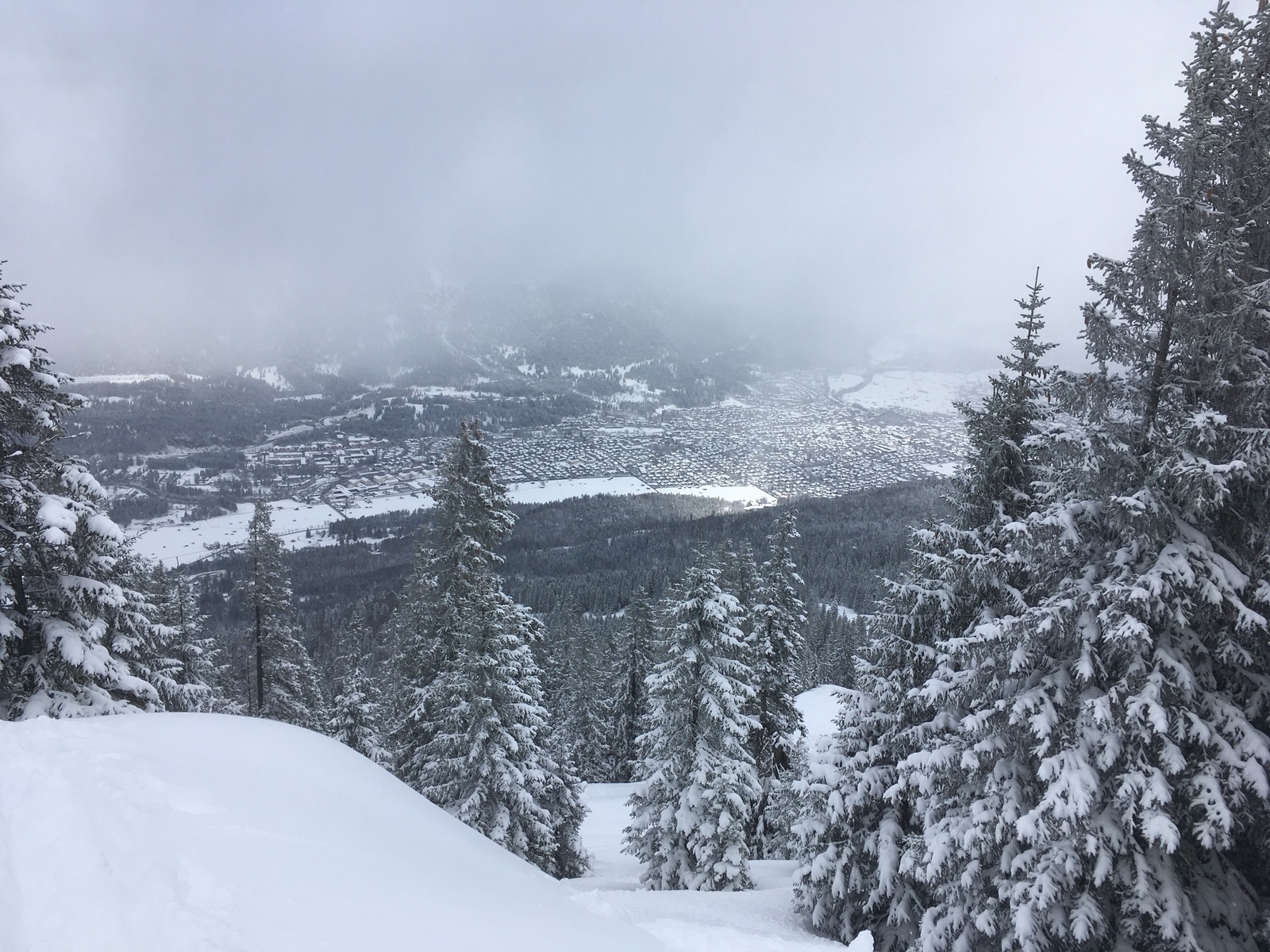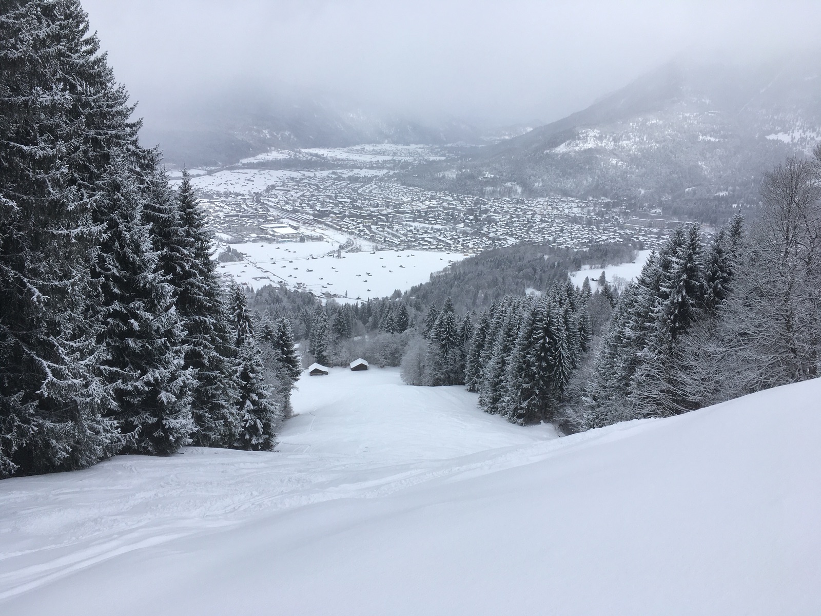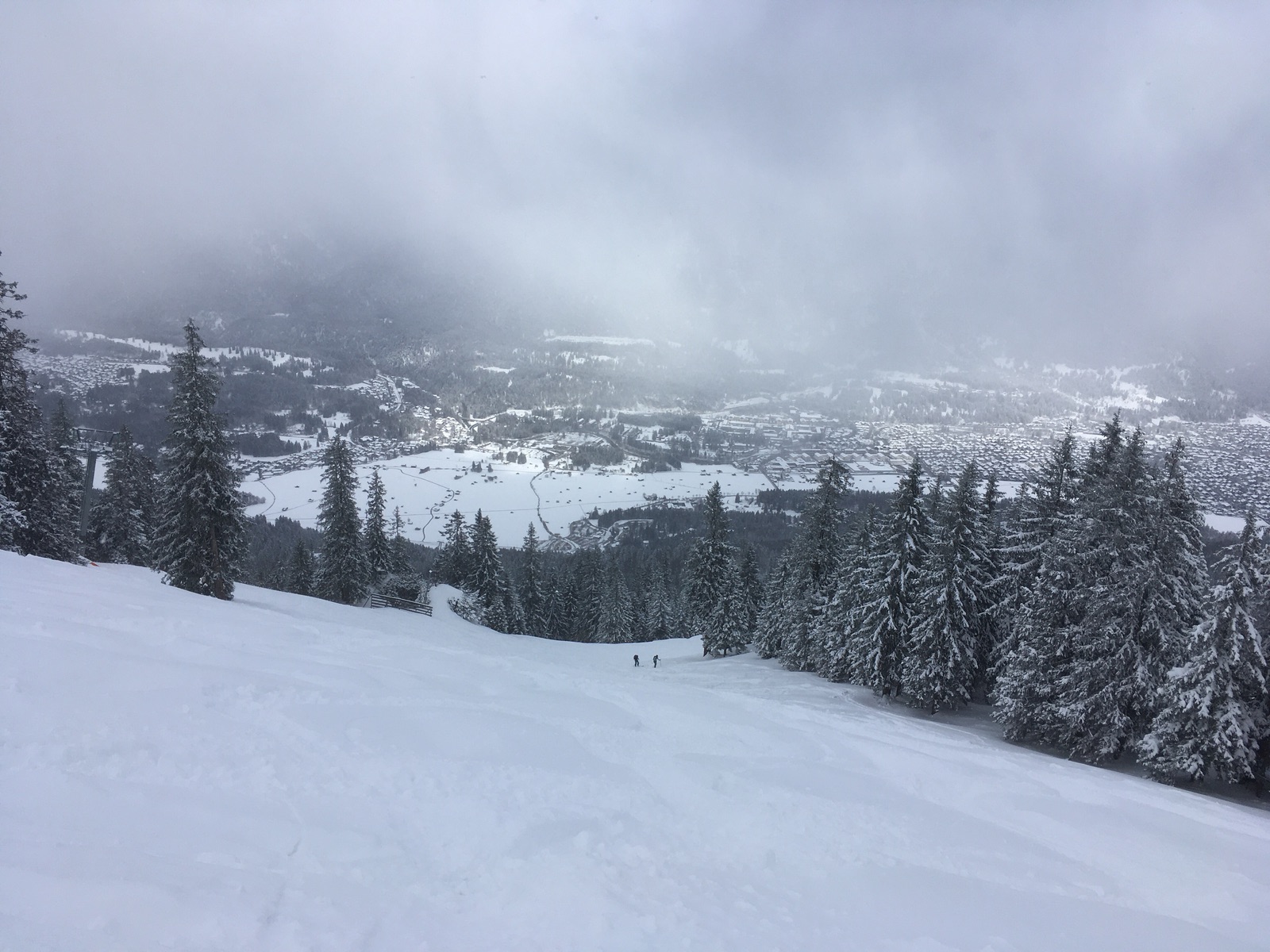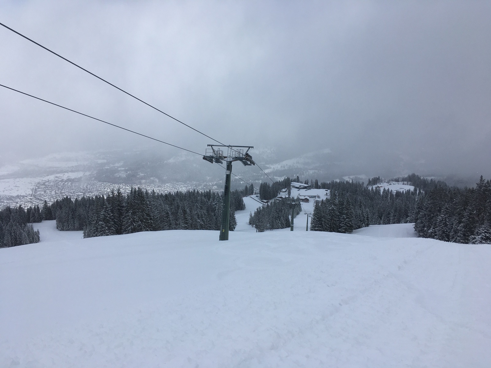 Angesichts des angekündigten schlechten Wetters wollte ich heute nur eine kleine Tour im geschlossenen Garmischer Skigebiet unternehmen: Vom Hausberg hoch zum Kreuzjoch. Aufstieg über die Hornpiste problemlos, Abfahrt oben toller Pulver, weiter unten auch guter Pulverschnee, aber man spürte insbesondere in den steileren Passagen doch die alten Spuren. Abfahrt über die Hornpiste ist aber nur bedingt zu empfehlen: Obwohl ich max. 5x Bodenkontakt hatte (apere Stellen vor dem Neuschnee, die man jetzt nicht gut sieht), habe ich mir ganz schöne Kratzer in den Belag eingefahren. Wahrscheinlich geht die flachere Dreh-Piste besser, außerdem dürfte da noch weitgehend eine Altschneedecke vorhanden gewesen sein.