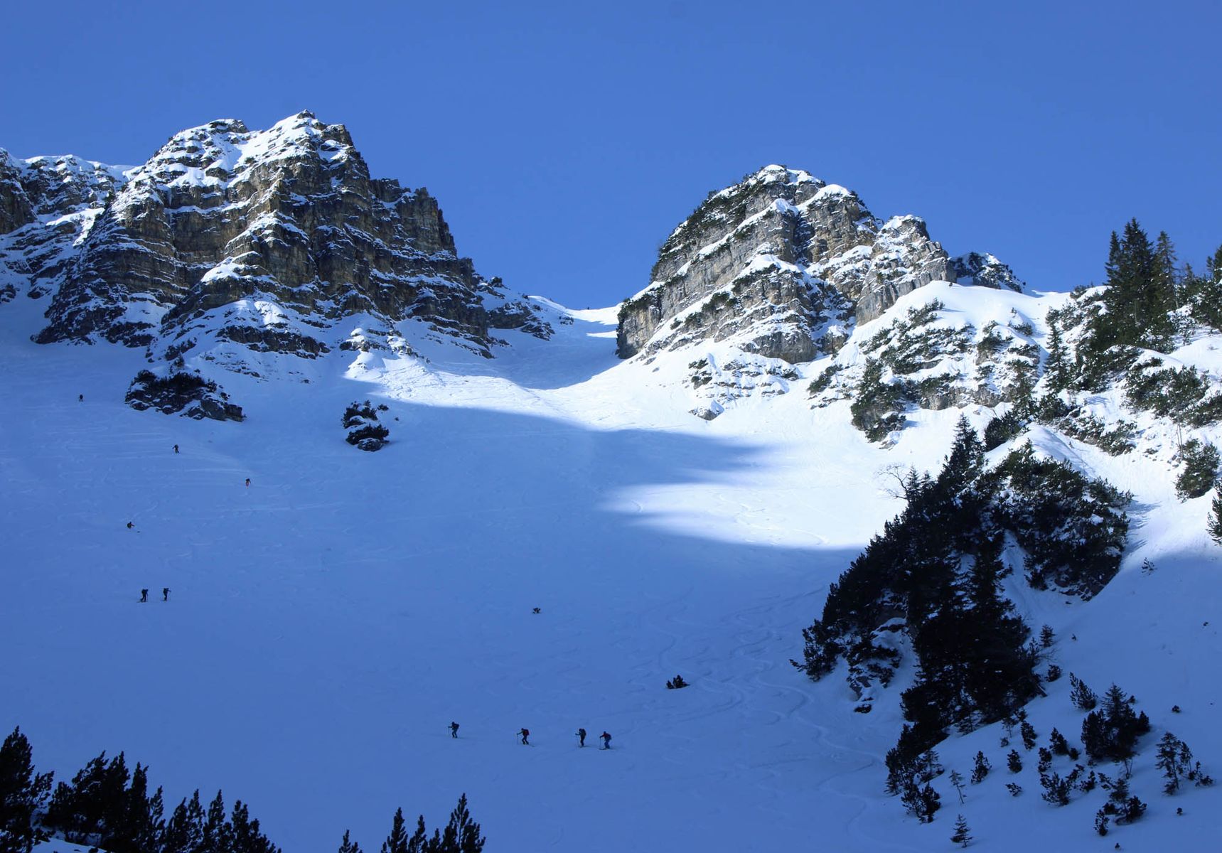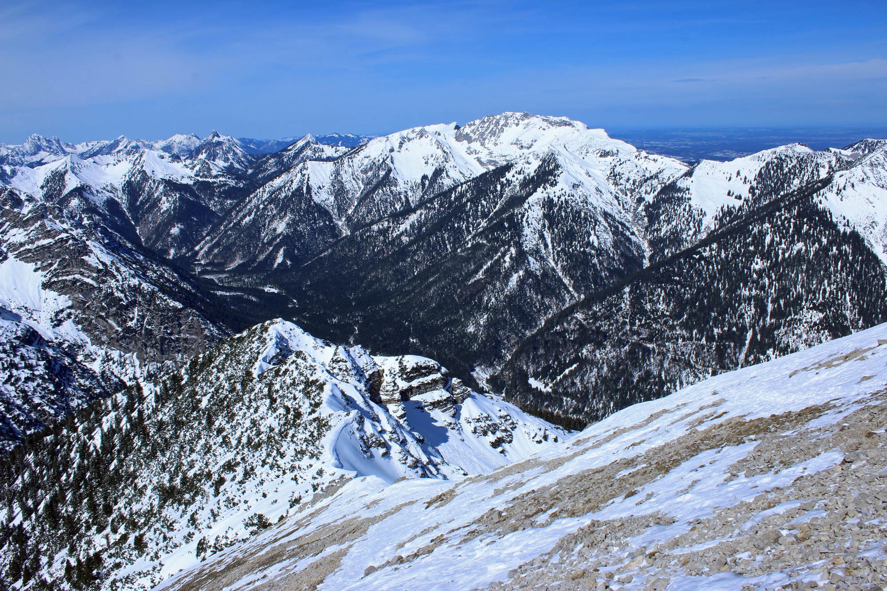 Im riesigen Nordkar unterhalb der Kreuzspitze gab es heute bis mittags großartigen Powder. an kann die Ski sogar gleich unten nach dem Bachbett anschnallen. Muss aber beim abfahren in der unteren Hälfte schon gut auf Steine achten. Bei Umsicht ist das Ganze aber noch ohne Steinkontakt möglichDer Rücken nach der Latschenkamm Querung ist (wie nicht selten) abgeweht. Hier muss man die Skier etwa 150Hm unterhalb des üblichen Skidepots abschnallen. Zum Gipfel selbst ist eine gute aber teils harte Trittspur vorhanden.