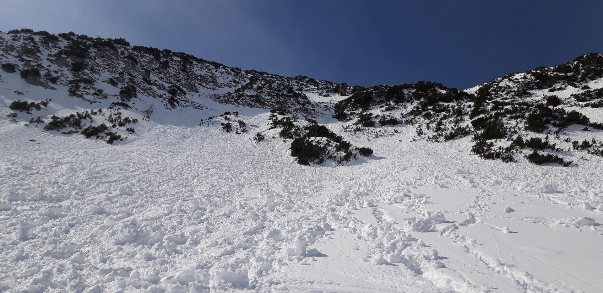 2. Zwar ist am Traithen aufgrund des Latschenbewuchses nicht zu erwarten, dass der ganze Hang als Nassschneelawine daherkommt, aber wenn man zu spät dran ist, kann man durchaus von den Bollern "abgeräumt" werden. Die sind zum Teil echt ziemlich groß. Heute sind auch um 12 noch Leute an der Rosengasse gestartet.