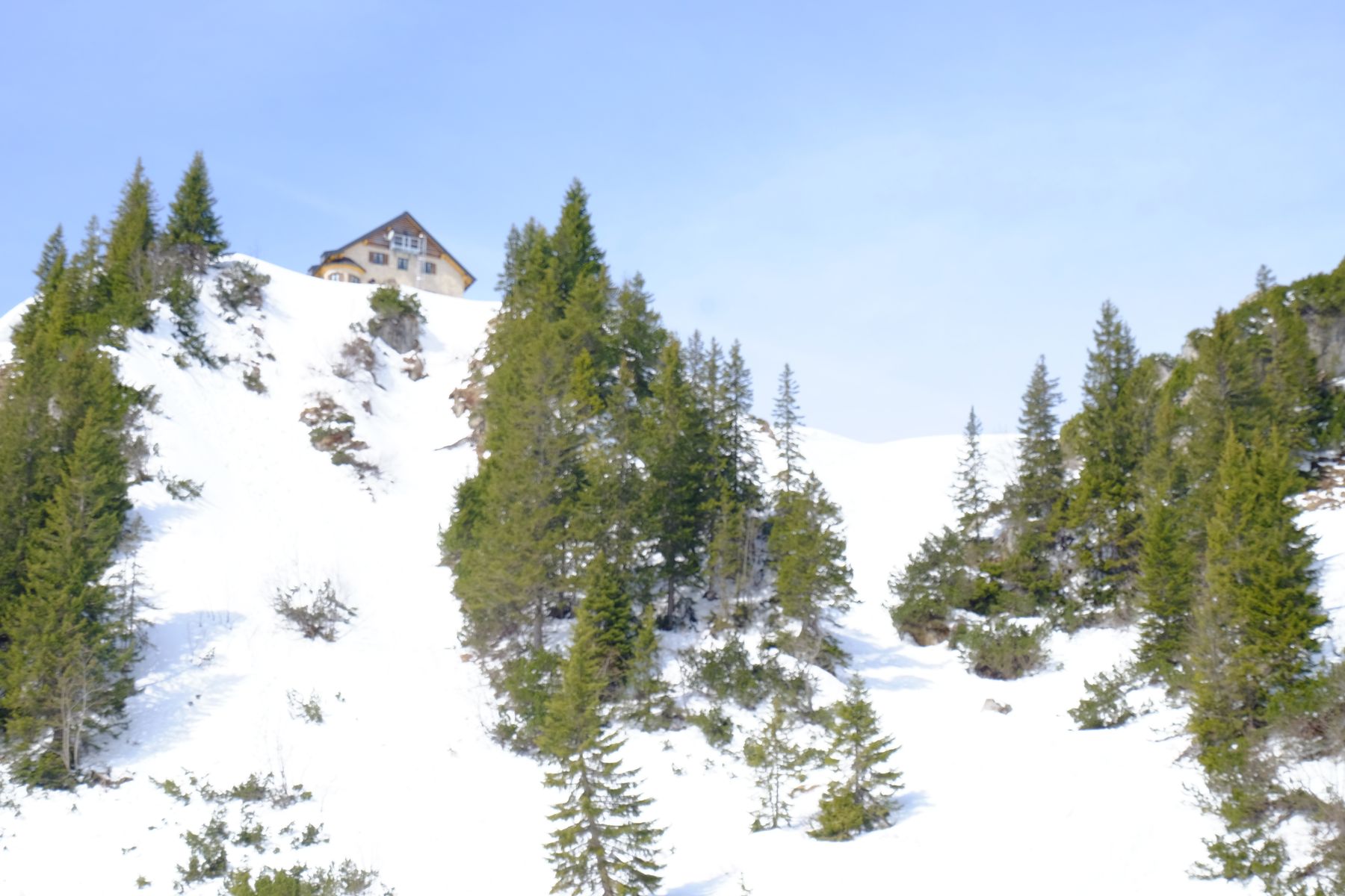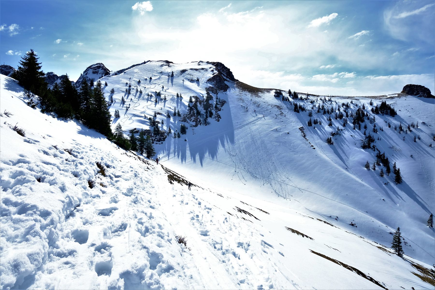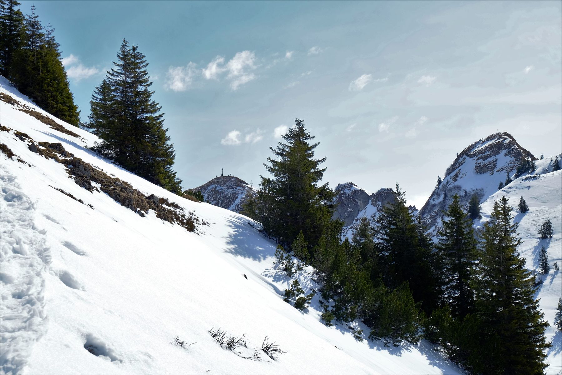 Über die Lifttrasse, den unteren Lochgraben (Piste ziemlich hart) und weiter die Pistenschneise. Im Flachstück eine Fleißaufgabe, weil durch Baumfällarbeiten die Verbindung zum oberen Lochgraben durch große Bäume verlegt war, links in der Seilbahntrasse weiter zum oberen Lochgraben. Über Taubenstein, unter dem Lempersberg vorbei und südseitig am Rotwandkopf gequert zur Rotwand.