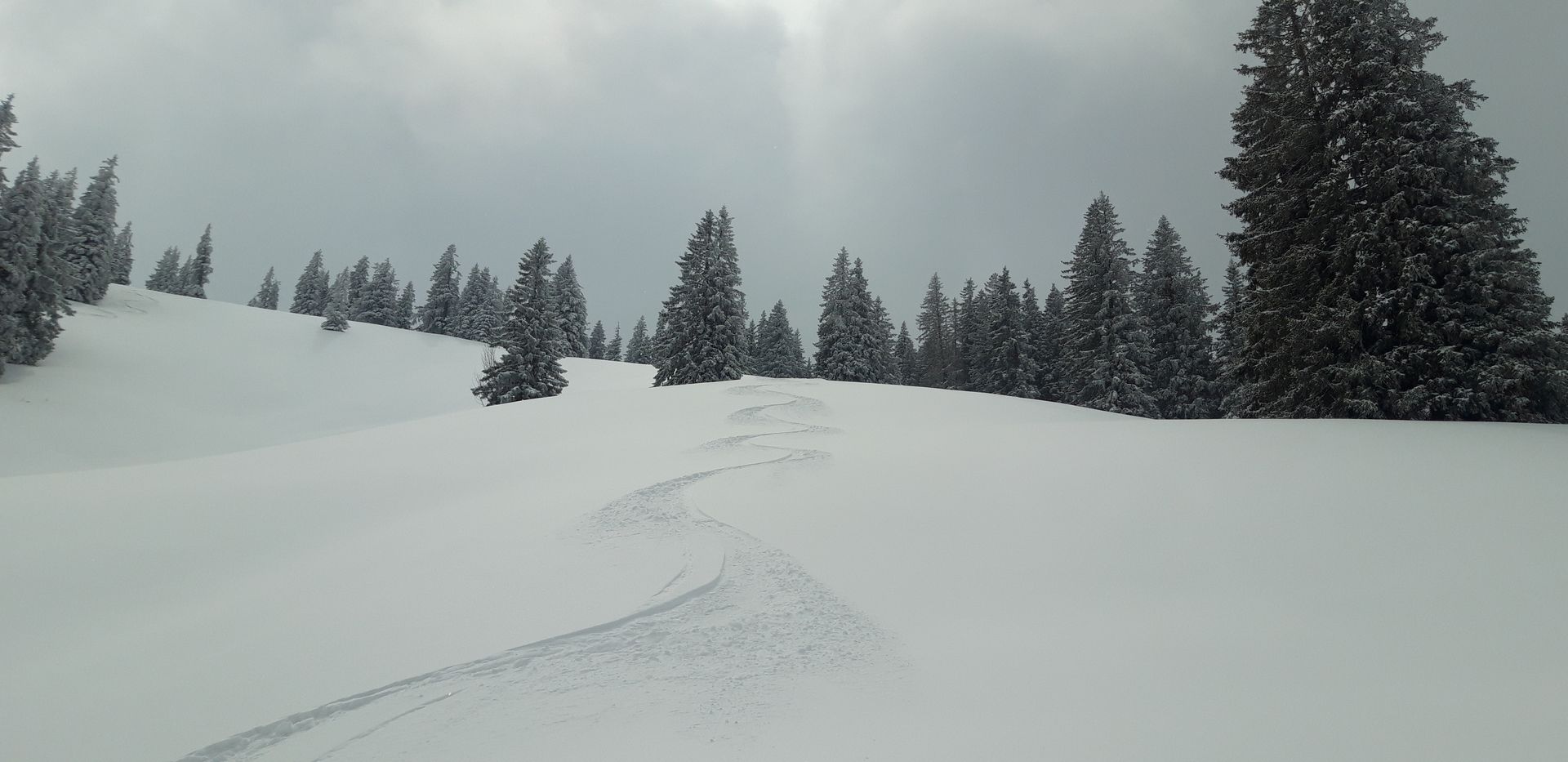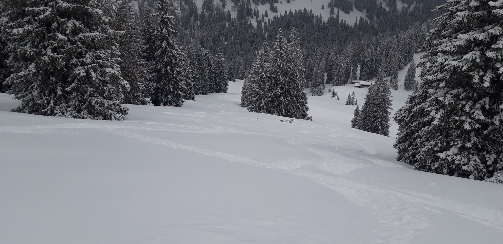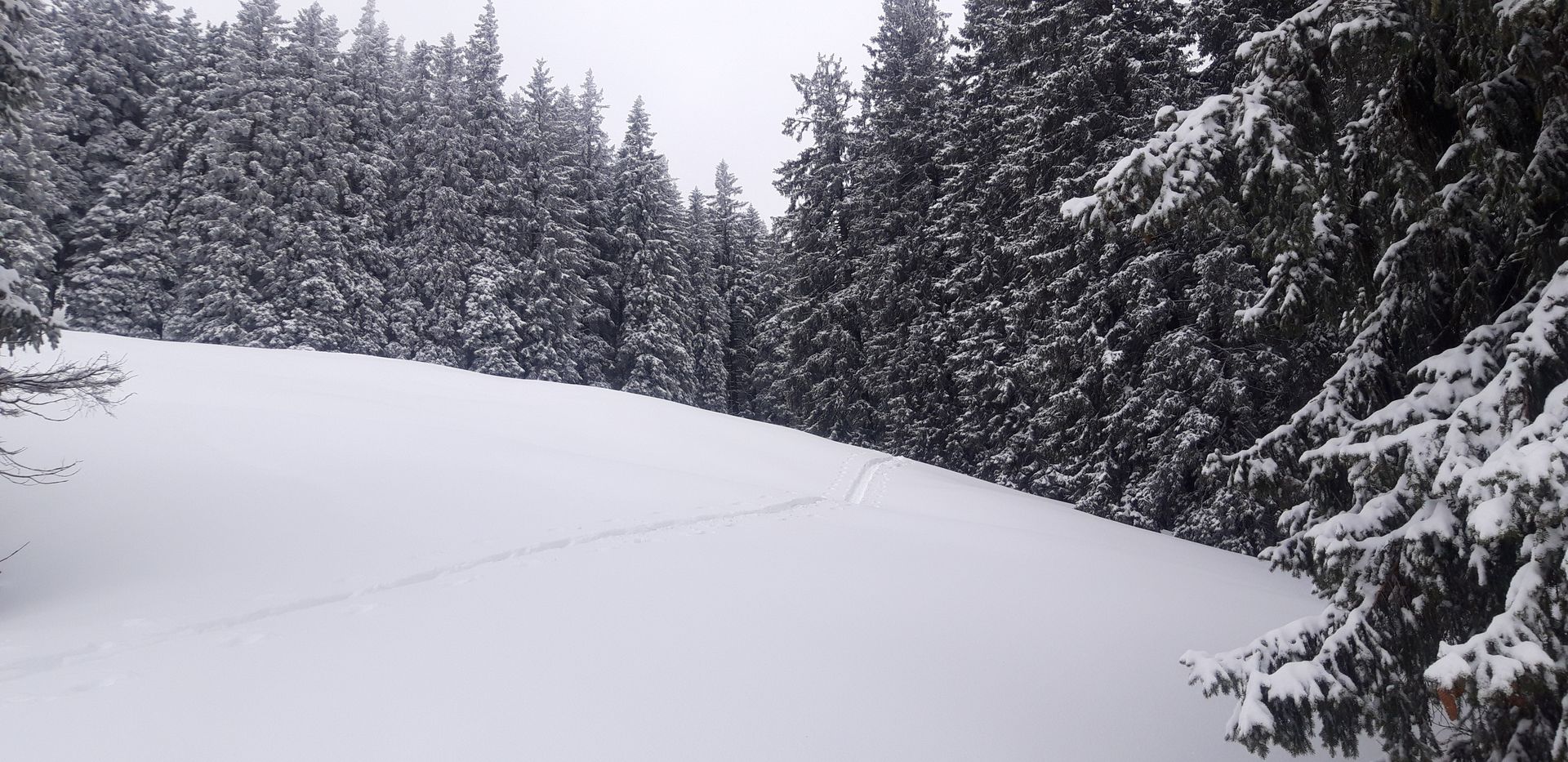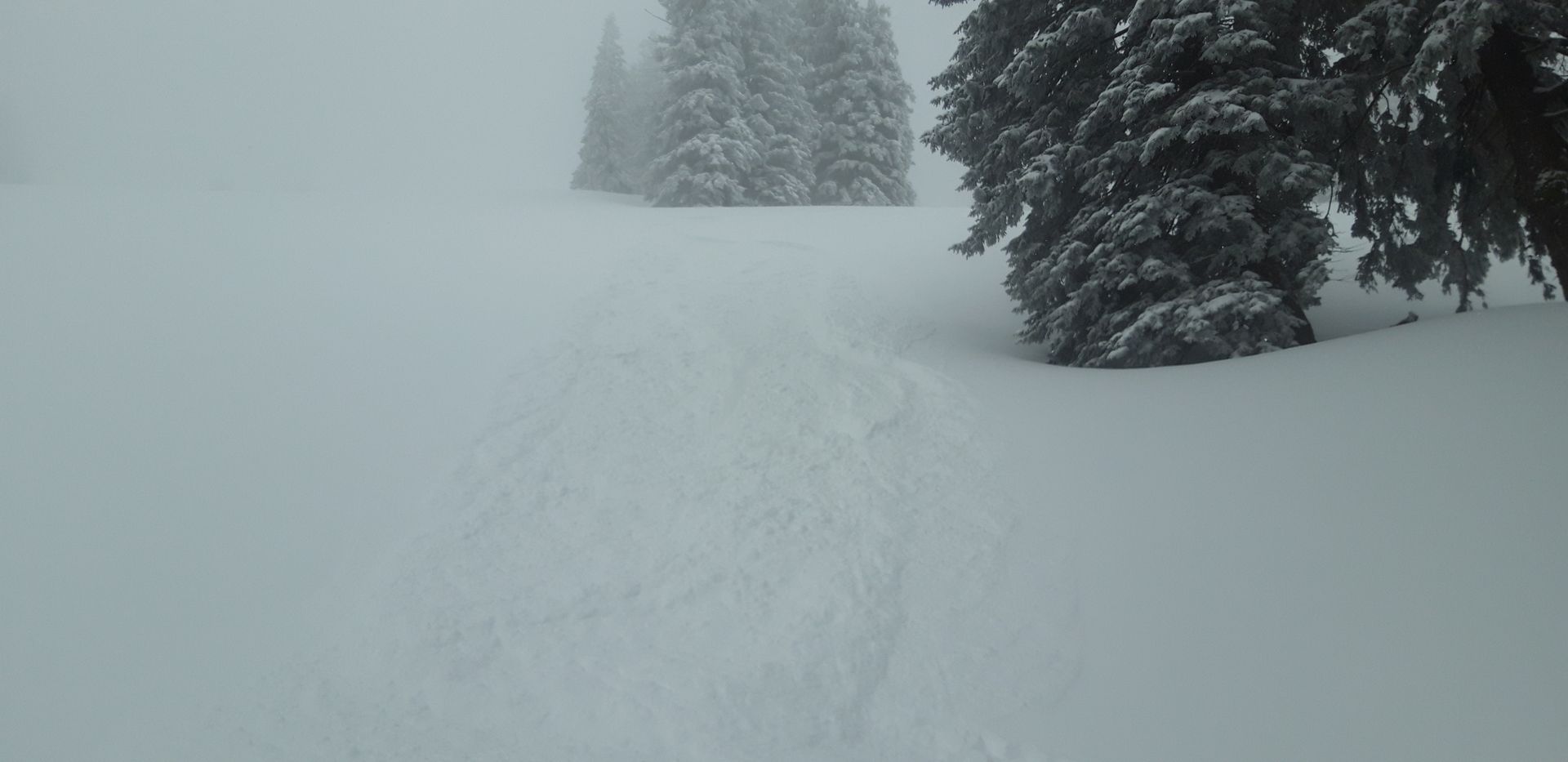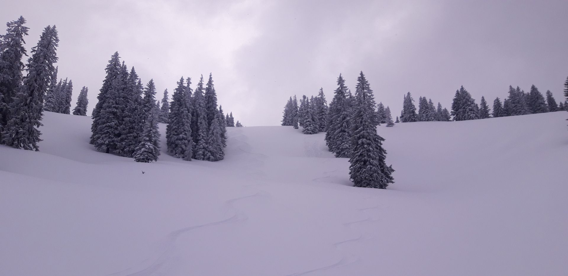 Lawinenlage/Schneedeckenaufbau: Die Schneedecke fand ich heute sehr interessant. Schon beim Spuren war zu bemerken, dass der Neuschnee gar keine Bindung zum Altschnee hat. Anhand der abgewehten Bäume war zu erkennen, dass der Großteil der Scheefälle von recht starkem Wind begleitet war. Nun stellte sich mir die Frage, ob vielleicht Triebschneepakete vorhanden sind - zu sehen waren keine und auch vom Gefühl beim Spuren her, hätte ich gesagt, dass der Neuschnee völlig ungebunden ist. Da aber weit und breit niemand anders da war, hab ich an einer offensichtlich eingewehten Stelle zur Sicherheit ein Schneeprofil gegraben, das meine Vermutungen auch bestätigte. Bei den Abfahrten ist, sobald es steiler wurde, einiges an Schnee mitgerutscht, aber lawinentechnisch alles total sicher. Bei den Bildern unten zeig ich das auch - ich hoffe man kann es dort erkennen, da die Sicht heute nicht die beste war. Eine spannende Frage ist, wie das hier morgen ausschaut. Als ich gegen 14 Uhr mein Bier bei der Abergalm getrunken habe, hat wirklich nur für wenige Augenblicke die Sonne herausgespitzt; diese kurze Zeit hat aber (typisch für die Jahreszeit) schon gereicht, um den Schnee zu verändern, denn nun konnte man Schneebälle machen, was vorher nicht ging - Der Schnee ist somit nicht mehr ungebunden, Schneebretter theoretisch also denkbar. Später hat es dann wieder zu schneien begonnen. Ginge ich morgen wieder dorthin, würde ich sicherheitshalber vor der ersten Abfahrt noch mal "in den Schnee schauen" oder die steileren Varianten meiden.