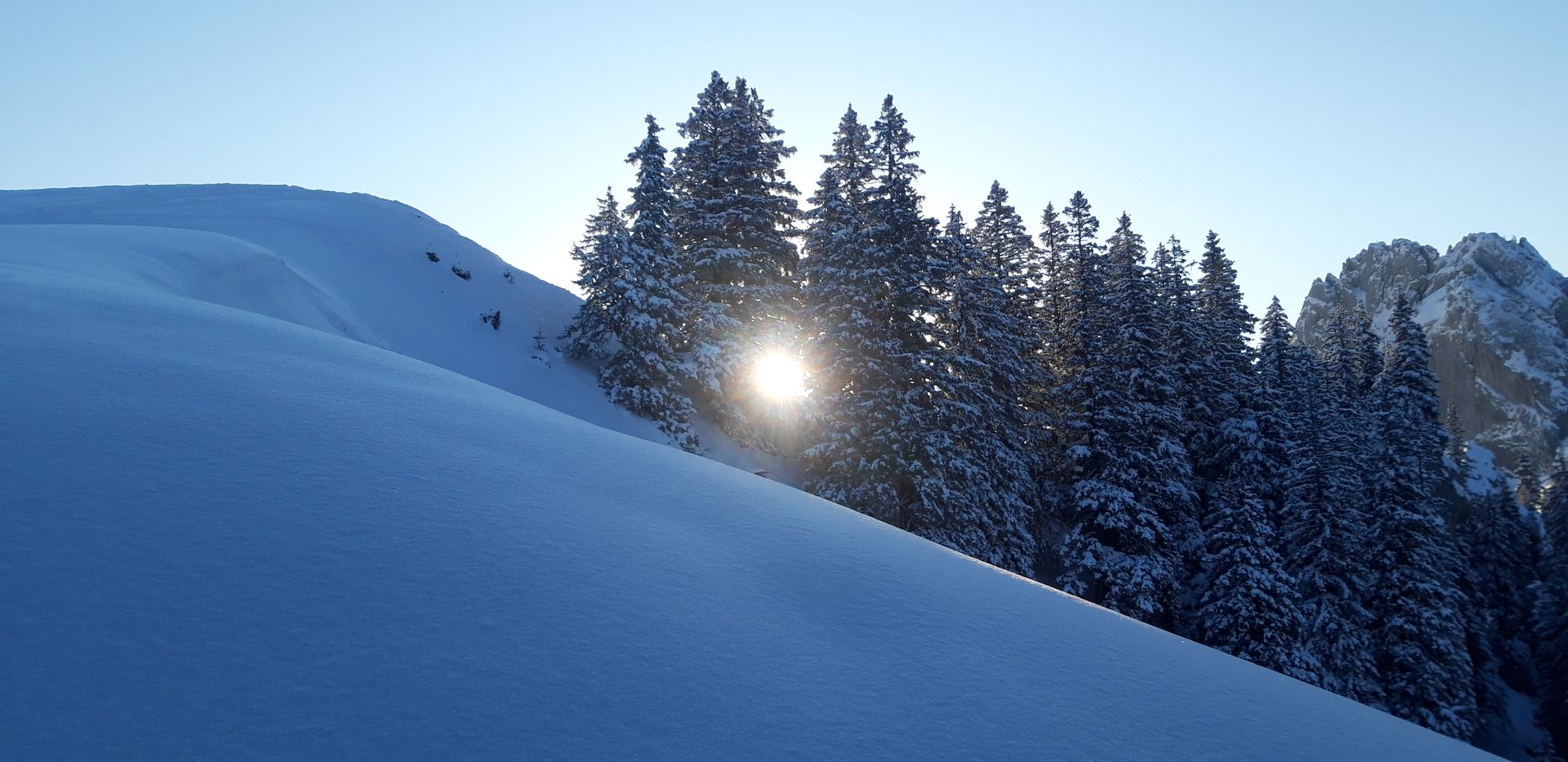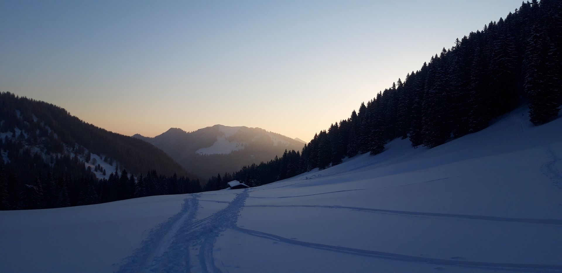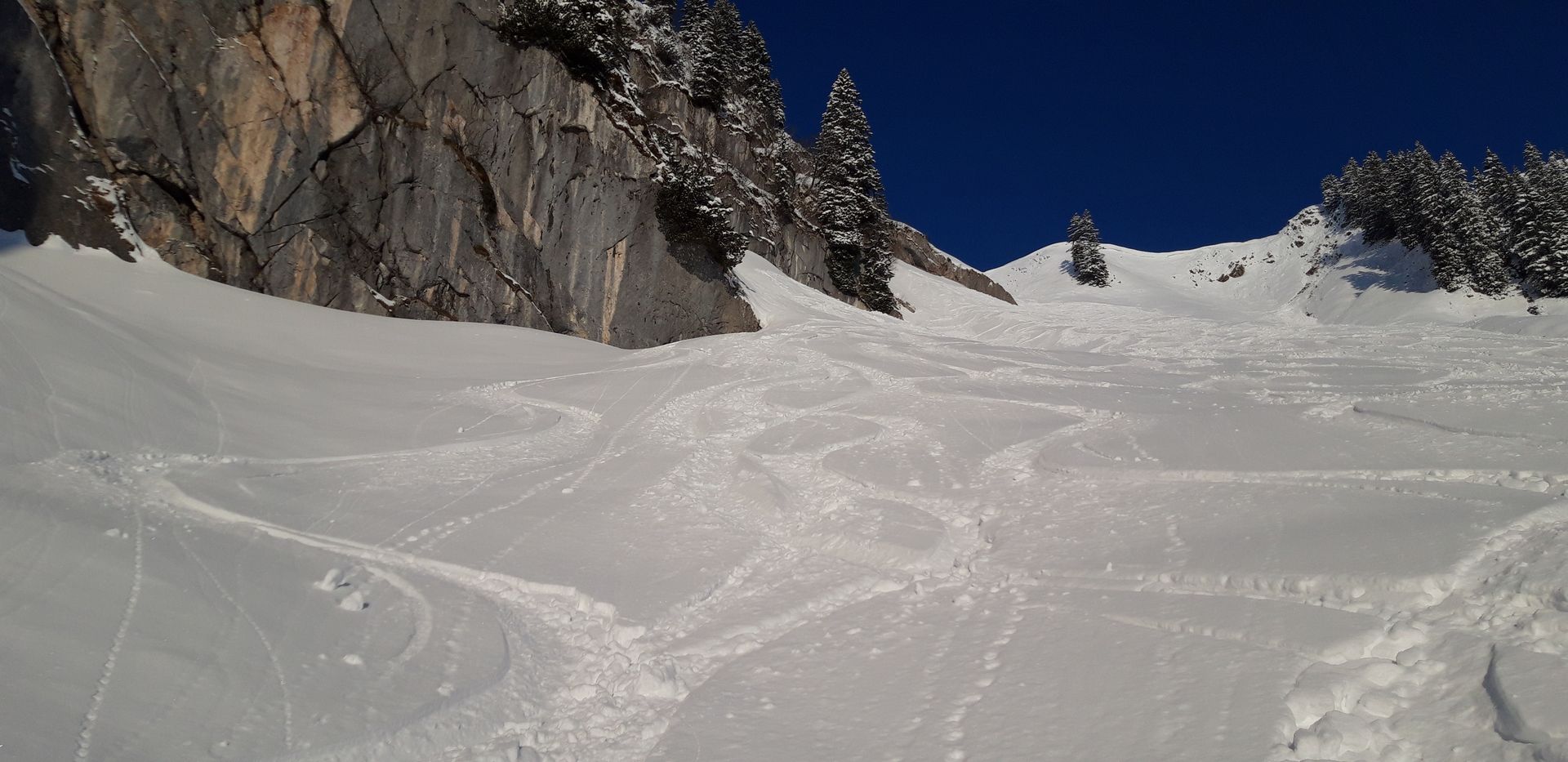 Da heute für mich terminbedingt keine große Tour drin war, bin ich ganz früh zur Plankenstein-Reibn aufgebrochen und es hat sich wirklich gelohnt! Vom PP weg geht es mit den Skiern (zurück auch komplett). Ich bin die Runde gegen den Uhrzeigersinn gegangen und kurz vor dem Plankensteinsattel zum Röthenstein hoch. Die Ostabfahrt ("Obstgarten") war um halb 8 super: Zwar von gestern her leicht verspurt, aber feiner Pulver. Der Hang ist um diese Zeit (genau wie die Abfahrt vom P-Sattel zum See) übrigens schon fast ganz in der Sonne. Vom Obstgarten habe ich eine neue Spur zum Riedereck gelegt, weil mir die vorhandene viel zu nahe an der Plankenstein-Nordwand verlief und sich dort schon bei den ersten Sonnenstrahlen Spindrifts lösten. Die Sibli-Abfahrt war dann leider Bruchharsch, aber das konnte den tollen Tagesauftakt auch nur marginal trüben.